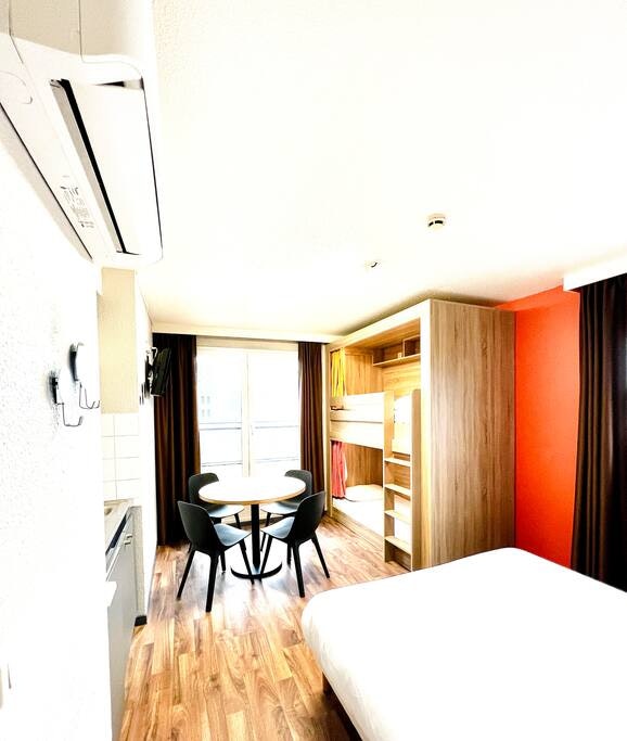 Everything is here! Comfort and practicality combined in a cozy, uniquely designed 15m² space. Whether solo or as a duo, unwind after a busy day of work or city exploration in a queen-size bed worthy of a 5-star hotel, as soft as grandma’s madeleines. A 49-inch TV and Chromecast are available in the room, along with full WiFi access. Enjoy a luxurious shower, eco-friendly products, and a cabinet of curiosities.