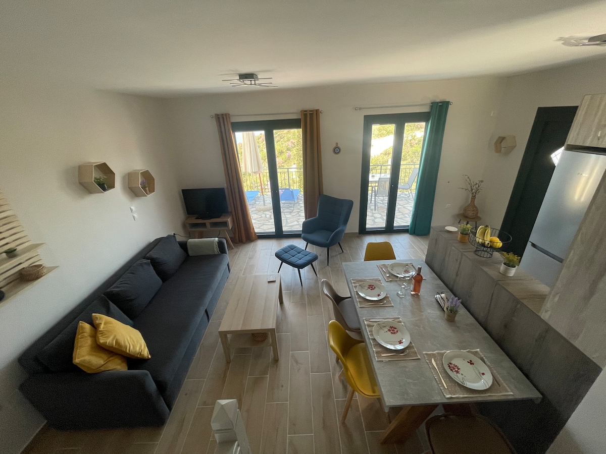 L'appartamento (55 mq.) è circondato da un cortile abbastanza verde e si affaccia sulla città di Lefkada così come sul mare. Gli amanti della mattina presto avranno l'opportunità di godersi la splendida alba e parte del tramonto. La struttura dista circa 2 km dalla città di Lefkada. È molto vicino (2 o 3 km) alle spiagge di Agios Ionnis, Mills, Gyra e Kastro e a 15-20 minuti dalla pittoresca Agios Nikitas e dalla famosa spiaggia di Kathisma.