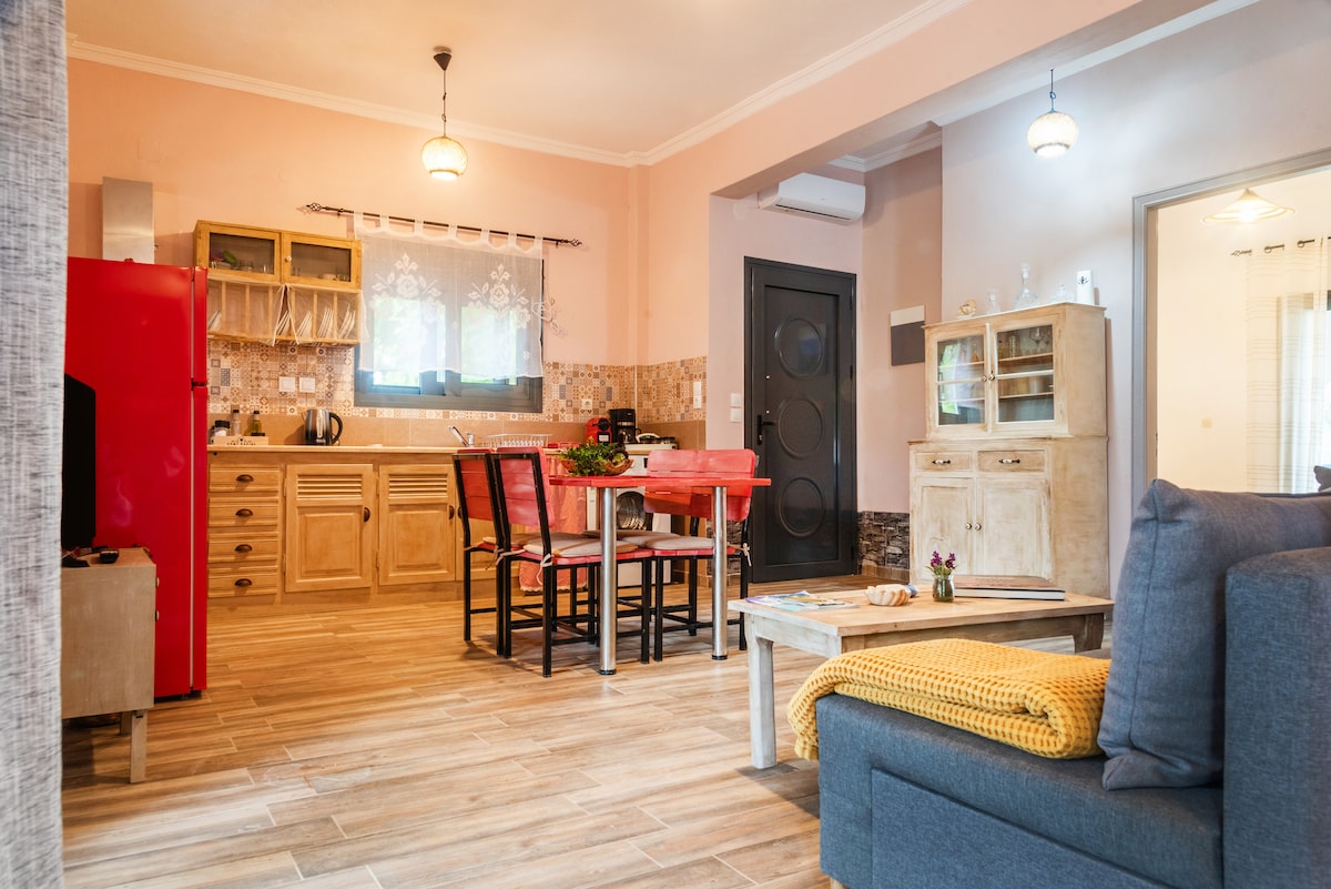 "Pretty house next to the beach" è una casa unica con un ampio giardino, a soli 2 minuti a piedi dalla spiaggia privata di Agios Nikolaos! La caratteristica principale della casa è che si trova in mezzo alla natura, accanto ad alberi verdi, lontano dal rumore e dalla folla! Dispone anche di barbecue, wifi, lettini sulla spiaggia e parcheggio privato, ma la cosa principale è l'assoluta pace e privacy offerte dalla casa e dalla spiaggia!