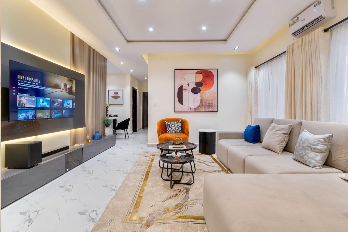 " Beautifully furnished 2 bedroom apartment located in a gated and secured environment within Lekki. Equipped with smart tvs (Alexa, Netflix and amazon prime), unlimited internet, 24 hrs power supply/Solar, DSTV premium, Ring video bell, fully air conditioned, water heaters, card/board games, parking space, fully equipped kitchen with microwave, refrigerator and kitchen utensils, washing machine, house keeper and/or in chef on request". We are here to give you a home away from home experience