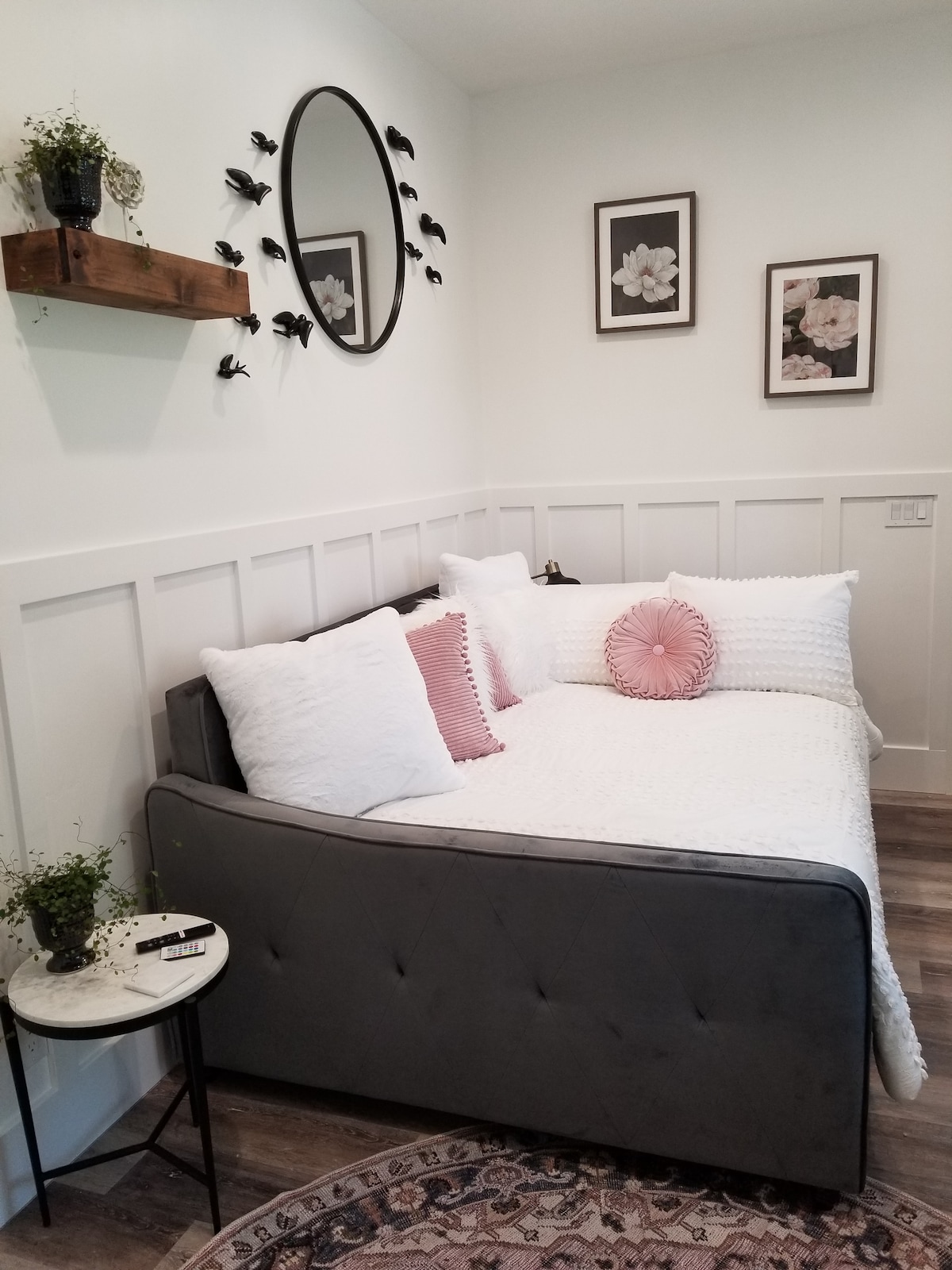 Goditi i film su uno schermo da 65 pollici con altoparlanti surround. L'angolo cottura include frigorifero, forno a microonde, tostapane e preparato per pancake per la colazione a tuo piacimento! Prodotti di carta forniti, in quanto l'unico lavandino è in bagno. Allenati nella nostra palestra condivisa 2 camere da letto con letto king-size e letto a castello (letti singoli, matrimoniali e con ruote) e 1 bagno Accesso per gli ospiti: Dovrai camminare sul retro e scendere circa 20 gradini. Cose da sapere: Lo spazio è il seminterrato della nostra casa, quindi potresti sentire i nostri ventilatori e rumori di fondo. Solo 2 veicoli
