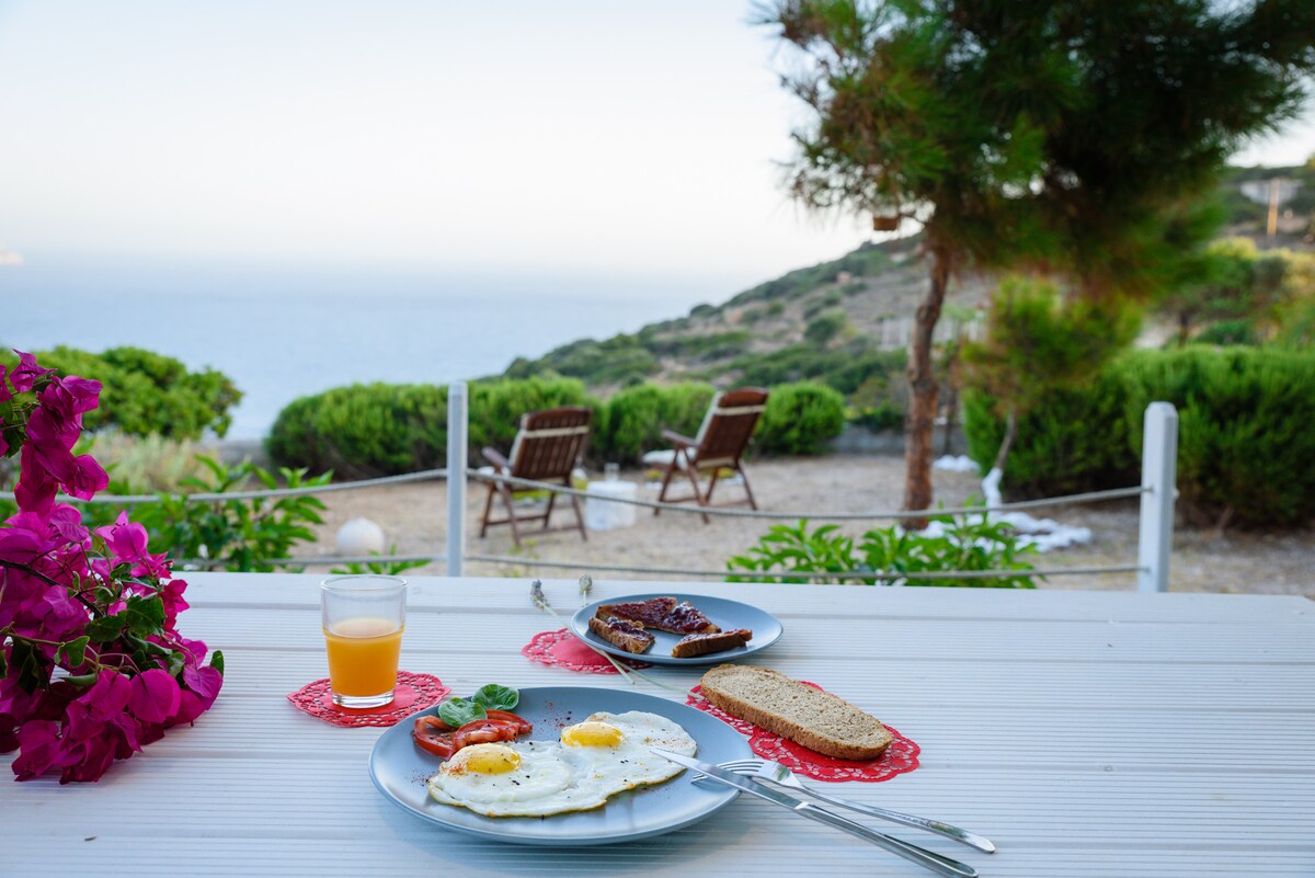 Ciao! Offriamo in affitto la nostra casa vacanze nella punta meridionale dell'isola di Chio. È un luogo perfetto per rilassarsi e godersi la splendida vista sul Mar Egeo. Il minuscolo isolotto di Venetico sullo sfondo, con il suo faro che lampeggia quando fa buio, sembra cambiare colore durante il giorno. Inoltre, potrai goderti un cielo pieno di stelle, lontano dall'inquinamento luminoso di una città.