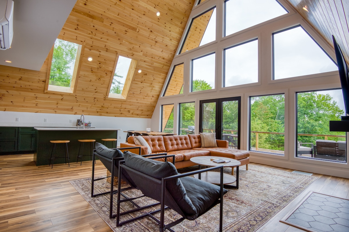 Piccola casa a forma di A sul fiume con vista sulle montagne e vasca idromassaggio