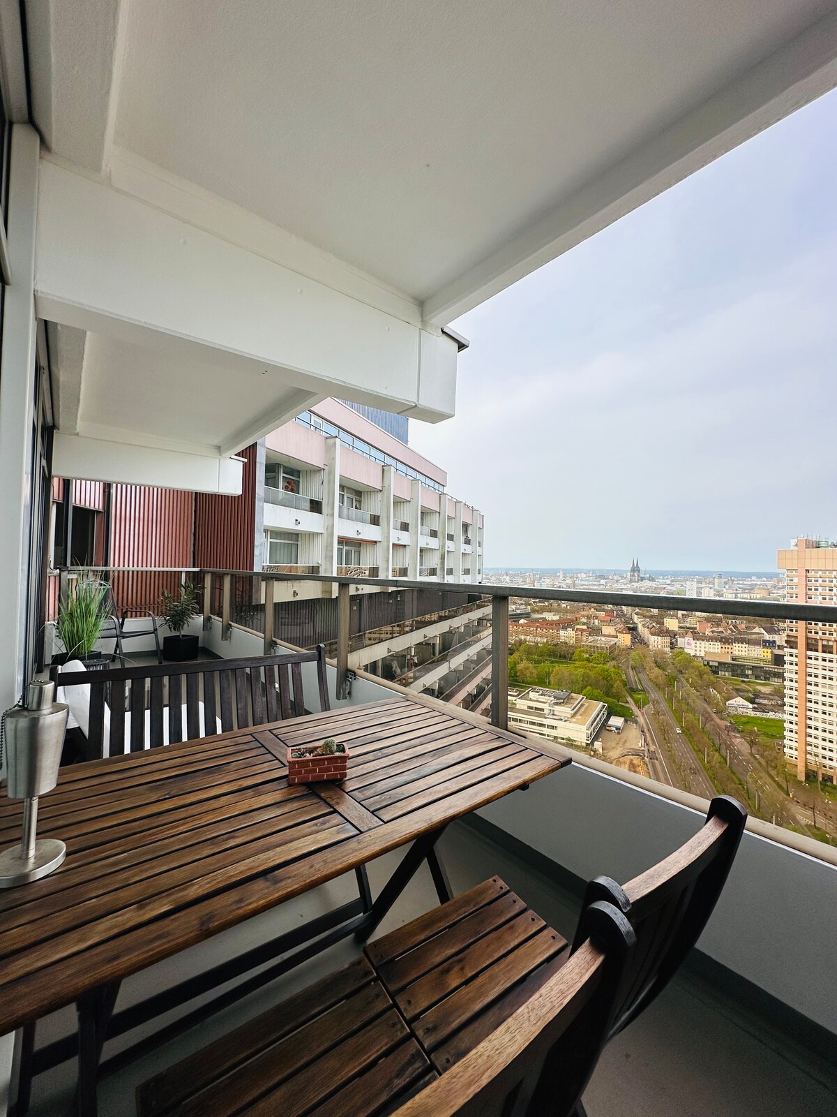 Appartamento molto bello con balcone ben attrezzato nel centro di Colonia vicino a Barbarossaplatz. Di fronte all'edificio troverai una fermata di autobus (autobus e tram). L'edificio offre bar e ristoranti e nelle vicinanze troverai un supermercato che apre fino a mezzanotte, bancomat e altri ristoranti. Un moderno ascensore ti porta al 27 ° piano e dall'appartamento avrai una splendida vista su Colonia. Una bella culla può essere trasportata senza costi aggiuntivi. Posto auto incluso.