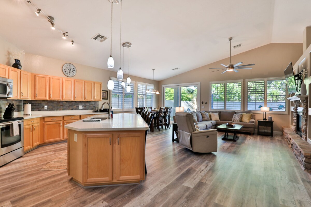 Benvenuto a casa, alla tua fuga di lusso. Perfetta per famiglie e gruppi di famiglie. Questa casa quasi nuova con 5 camere da letto e 3 bagni dispone di 2 suite principali. Cucina extra large con elettrodomestici in acciaio inossidabile quasi nuovi. Soggiorno di grandi dimensioni con TV da 70" e spazio per giocare. Situata in un quartiere di fronte al parco. Vicinanza a ottimi punti escursionistici, campi da golf pluripremiati e impianti sportivi professionali, tra cui allenamento primaverile e NFL. Fai di questa spaziosa casa la tua base per qualsiasi avventura in Arizona.