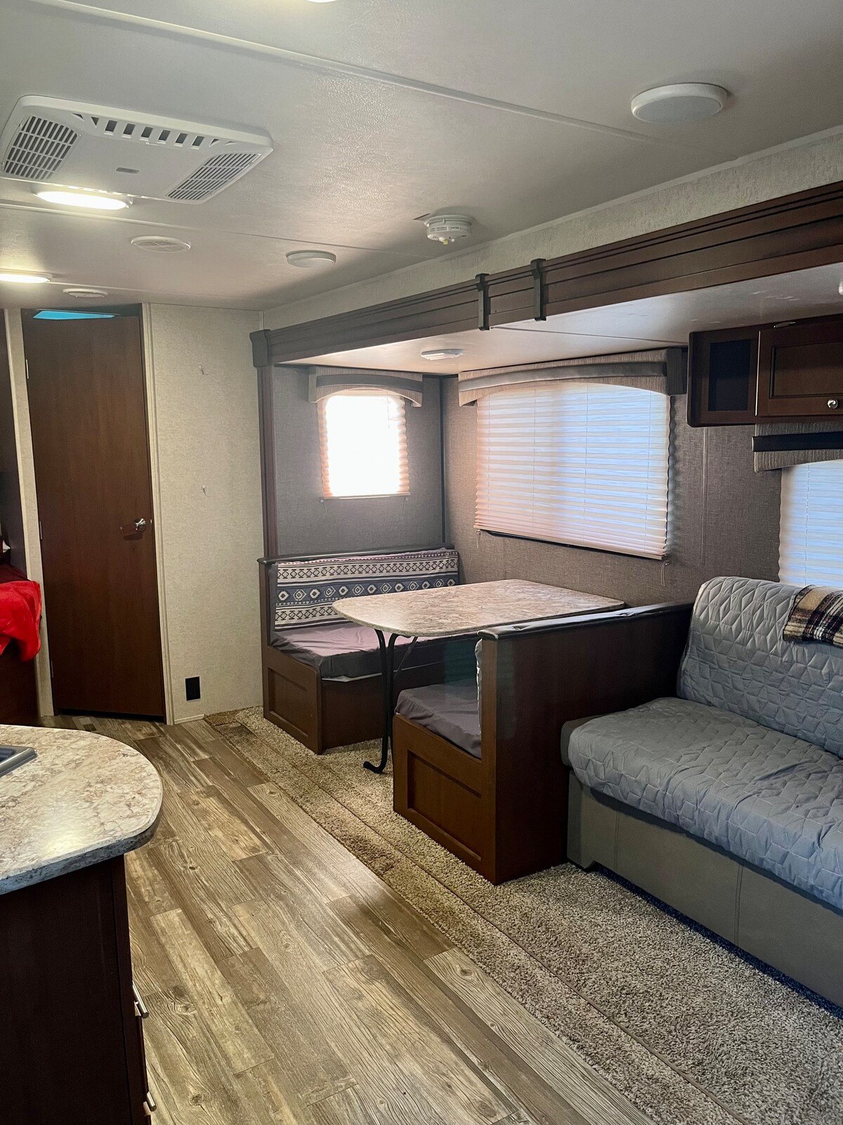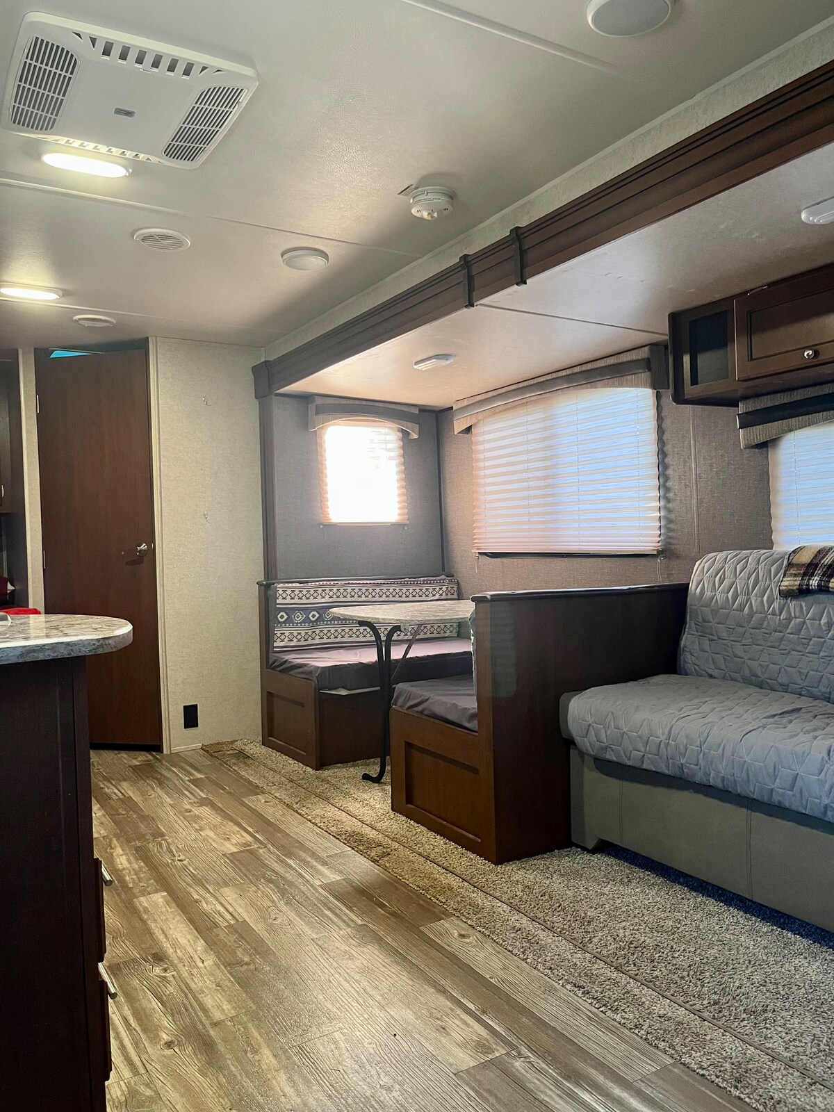 This spacious and modern RV has all the features you need for your next adventure! It can sleep up to 8, with big bunk beds in the back, a private Master bedroom, and even a U-shaped dinette that converts into a cozy bed for two. The Kitchen is equipped with a refrigerator, stove, and microwave. And let's not forget about the private bathroom with a shower and abundant storage for your storage needs. Plus, the large panoramic windows provide amazing views of the great outdoors.