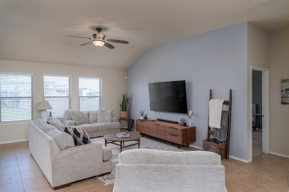 Ti diamo il benvenuto nella tua nuova casa lontano da casa! Questa oasi si trova a 20 minuti da Austin, a 45 minuti da San Antonio e a 10 minuti da San Marcos. Goditi i vicini chioschi di cibo di strada, o lascia che i bambini si divertano al parco giochi o alla piscina del quartiere. Gli interni eleganti sono dotati di comfort moderni come TV da 75", internet, giochi, patio esterno, braciere e altro ancora. Sarai a meno di un miglio dall'ospedale e a pochi minuti da ristoranti, negozi, H-E-B, parco per cani e dall'autostrada I-35.