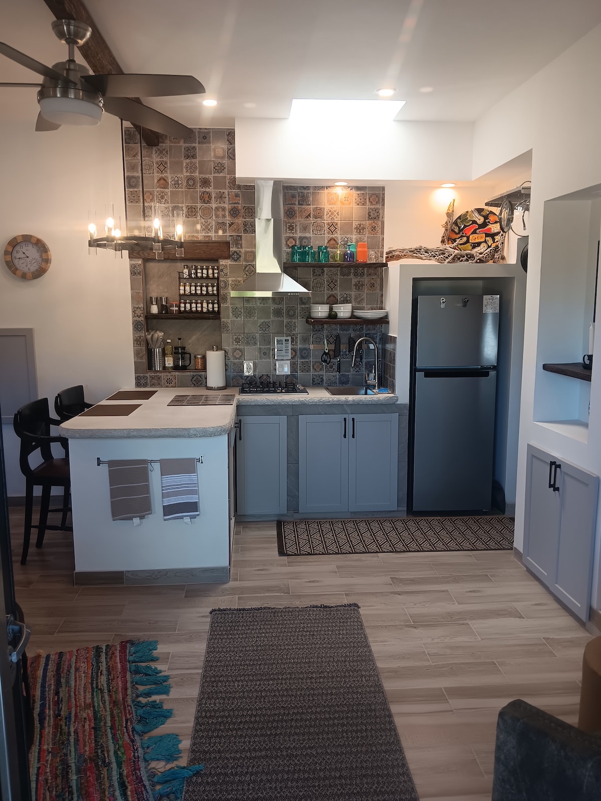 In città - Accogliente casa a pianta aperta - perfetta per 2 persone ma può ospitare 4 persone. Grande recinto chiuso e parcheggio sicuro. Raggiungibile a piedi nel cuore di Los Barriles. Vicino a negozi, ristoranti, hotel, pickleball e spiaggia! Stile unico, completamente arredato. 2 letti queen size, 2 bagni *nuovo bagno esterno. Angolo cottura completamente attrezzato con patio coperto annesso. Piccolo loft e patio sul tetto con vista sull'oceano, albe, tramonti e osservazione delle stelle. Wi-Fi StarLink, smart TV e aria condizionata, lavatrice e asciugatrice.
