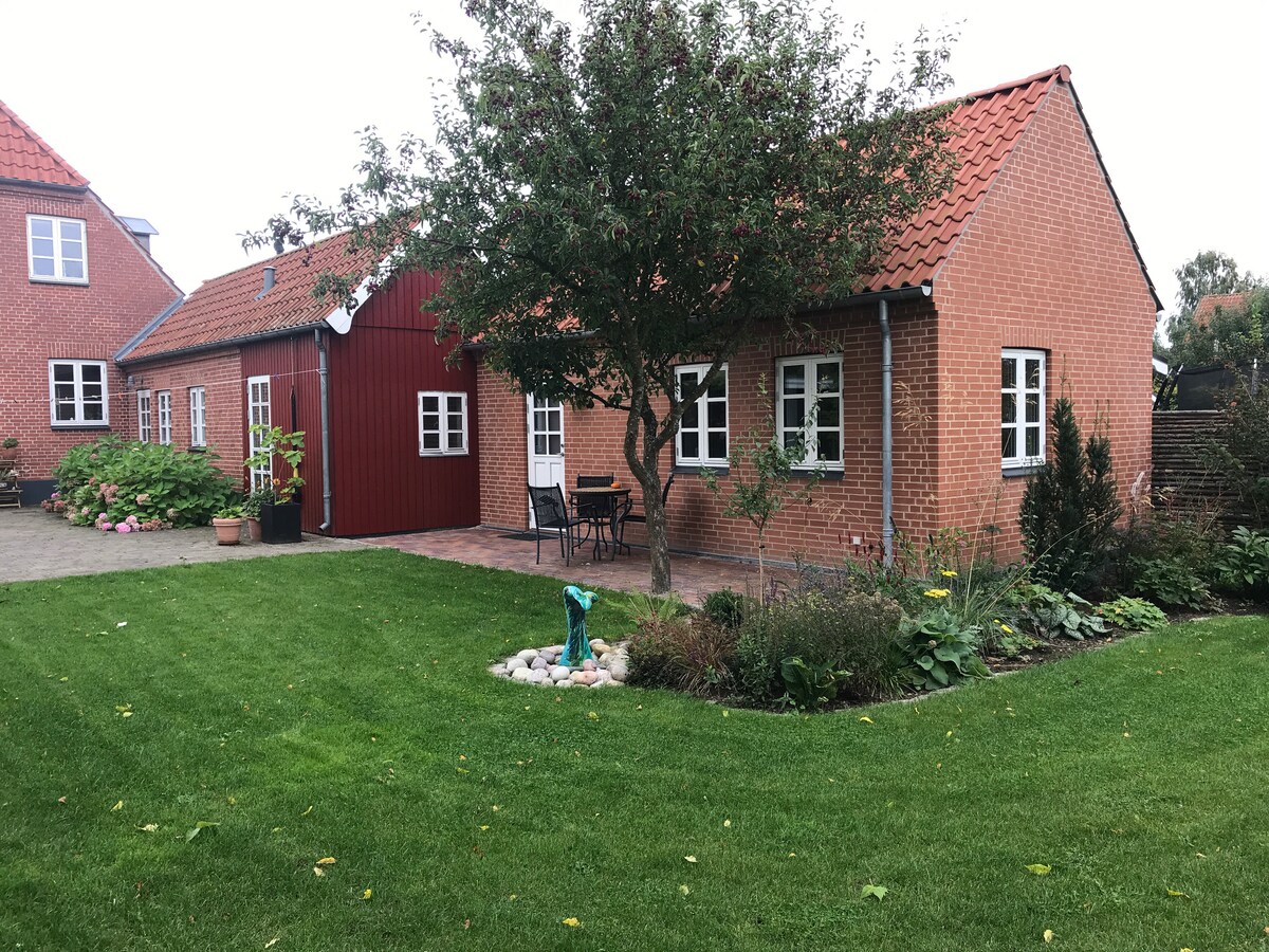 Bo på landet på 4 - længet gård i lejlighed i 2 plan. Vi har en hyggelig gårdsplads, hvor alle måltider kan nydes i læ. Til lejligheden er egen terrasse med udsigt over haven. Der er en stor parklignende have på ca. 16.000 m2., hvor man kan gå en tur, gå med hunde og børnene kan lege. Der er mange hyggekroge i haven. Børnefamilier er meget velkomne. Vi kan lide, at vores gæster føler sig hjemme. BEMÆRK at ved 5 gæster er den ene opredning på luftmadras I stuen. Mulighed for længere ophold.