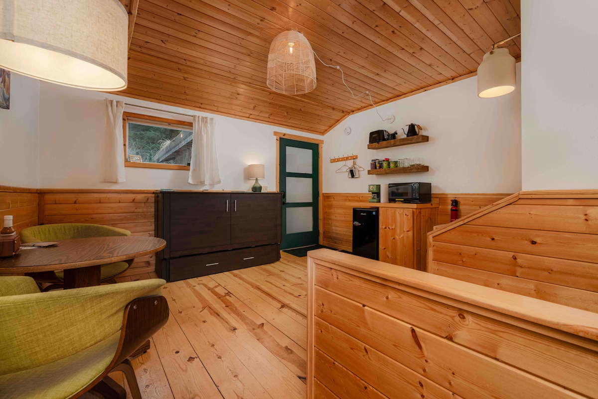 NUOVA PROPRIETÀ! AL MOMENTO IN FASE DI RISTRUTTURAZIONE DEGLI INTERNI! Rustic Roots offre 7 unità a notte. Il nostro edificio Greenhouse Suites dispone di quattro camere con vista sull'acqua, con una terrazza sul retro condivisa, un anello per falò, una cucina, un tavolo da picnic e un barbecue. Forest Suite si trova al secondo piano con un letto matrimoniale grande nella camera da letto principale, oltre a un letto matrimoniale nell'area comune del loft, un bagno privato en-suite e un bar. Perfetto per gruppi fino a 4 persone (o piccole famiglie).
