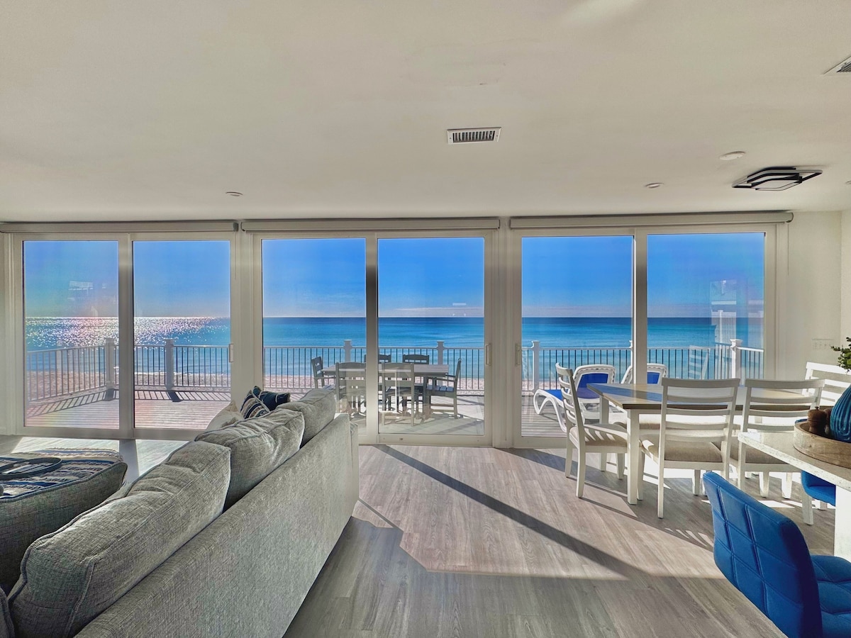 Stunning 7th floor unit BEACH FRONT, tastefully renovated, new furniture and appliances, with large balcony to enjoy the BEST SUNSET IN THE COUNTRY! Perfect LOCATION on the “quite end” of PCB, combining a relaxed environment, while 5-10 min drive from all the main city activities, including shopping, restaurants, and family entertainment. Regency Towers charges a one-time $40 fee per reservation for one parking permit and pool wristbands. Must be at least 21 years of age to rent.