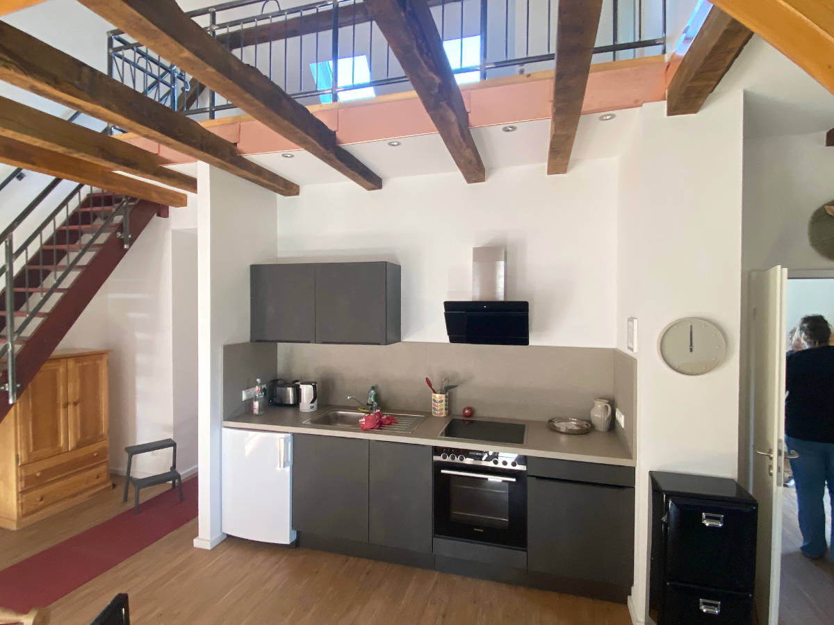 Unsere erste Ferienwohnung befindet sich in der vorderen Hälfte des ehemaligen Kuhstalls. Im Erdgeschoss befindet sich eine charmante Kücheninsel, der Ess- und Wohnbereich sowie das Badezimmer. Das Doppelbett im oberen Schlafbereich wird durch ein Einzelbett ergänzt, zusätzlich gibt es noch ein bequemes Schlafsofa für zwei (insgesamt 5 Schlafplätze). Unser zweiten Inserat, das Eulennest, befindet sich gleich daneben und kann dazu gebucht werden. Dann ist Platz bis zu 8 Personen.