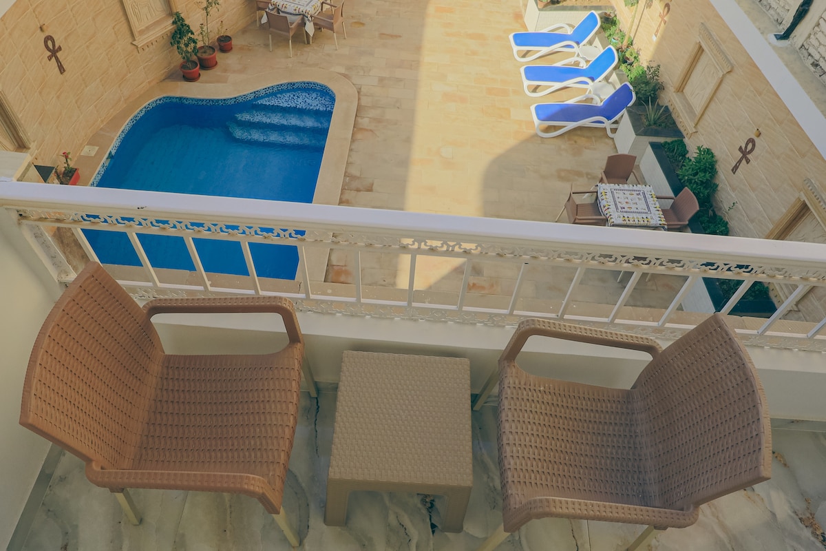 nuovo appartamento tranquillo con piscina e giardino e posizione perfetta 1 minuto a piedi e si può raggiungere tutto come bancomat . ristoranti . farmacia. supermercato e anche stazione auto per raggiungere tutti i templi 2 minuti a piedi per raggiungere il traghetto per est chiedici in chat del programma di 3 giorni per visitare tutti i templi con auto privata e tour leader e pallone d'aria calda e viaggio nel nilo con fluka e altre cose