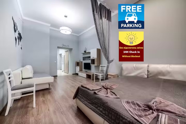 I nuovi appartamenti di lusso di design (35 m2) si trovano nel cuore del centro storico vicino all'Opera Nazionale di Leopoli. Qui troverai tutto il necessario per ospitare comodamente fino a 4 persone. Wi-Fi gratuito, aria condizionata, Smart TV, letto matrimoniale (160x200) in camera da letto e comodo divano letto in soggiorno. Cucina completamente attrezzata e bagno con lavatrice. Parcheggio gratuito in strada vicino alla casa, molti divertimenti e monumenti architettonici raggiungibili a piedi.