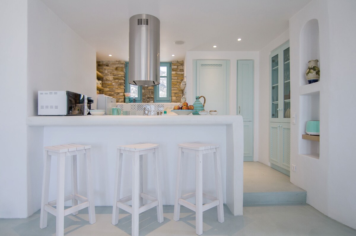Scopri la vera Santorini, al di là degli affollati percorsi turistici. La Mayia Cave House è una tradizionale casa grotta cicladica del XIX secolo ristrutturata, situata nel tranquillo borgo medievale di Pyrgos. Offre tutti i comfort moderni, una spettacolare grande piscina privata riscaldata, una vasca idromassaggio privata sulla terrazza e una vista incredibile su Santorini, incluso il famoso tramonto.