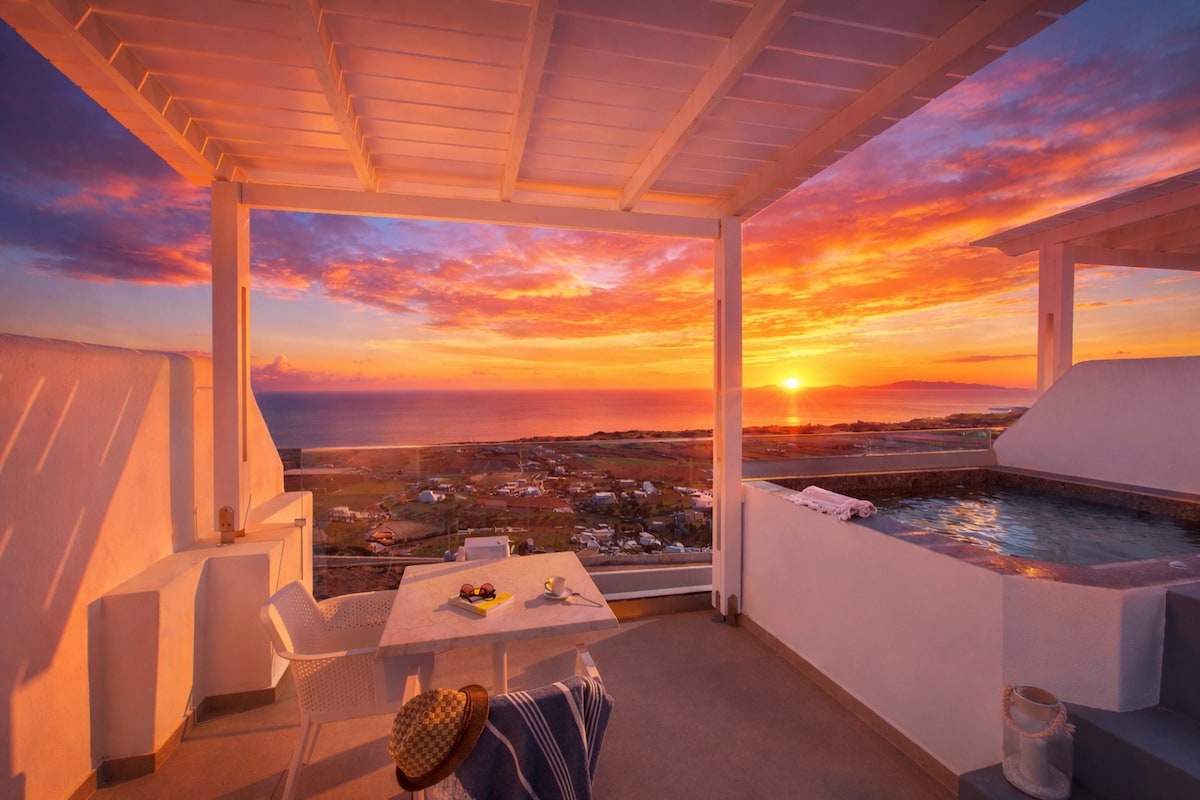 L'omonima suite della villa Mirabo, costruita in stile maisonette, dispone di due diverse camere da letto su due livelli con letti matrimoniali, che la rendono ideale per famiglie, gruppi di amici e coppie in luna di miele che vogliono godersi le vacanze in modo molto confortevole e rilassante. I due bagni separati e spaziosi sono arredati con gusto e il soggiorno offre ore di relax. Al secondo piano, potrai goderti la vista sulla caldera e sul vulcano e il tramonto dal balcone privato.