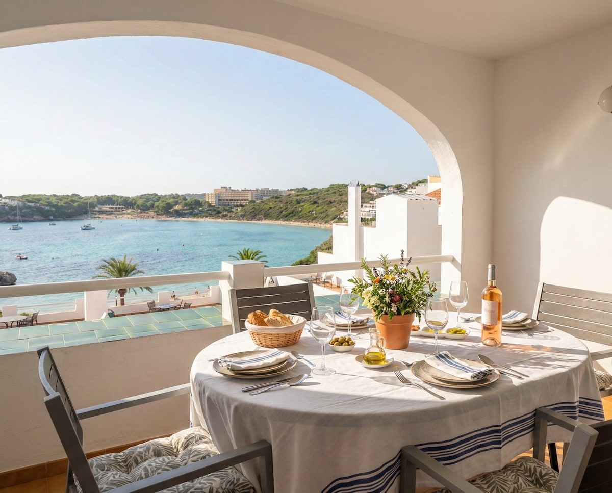 Acogedor apartamento de 40 m² con 2 terrazas privadas y vistas al mar, ideal para relajarse en Menorca. 1 habitación, 1 baño, salón con cocina integrada y 2 camas de matrimonio (para 4 personas). Perfecto para parejas o familias pequeñas. Situado en un complejo familiar tranquilo con zonas verdes, cerca de supermercados, parada de autobús y GR. A solo 200 m de la bahía de Arenal d’en Castell, disfruta de sol, mar y actividades al aire libre. ¡Vacaciones inolvidables con todas las comodidades!