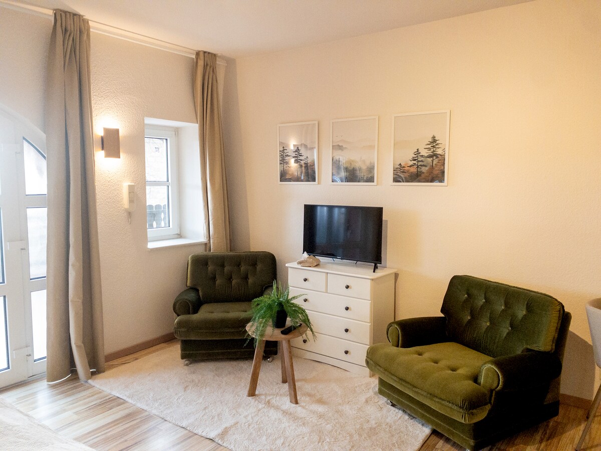 Di fronte alla nostra casa pubblicata nel 1724, situata nel cuore del vecchio villaggio vinicolo di Hambach, la fontana della piazza della chiesa spruzza, ombreggiata dal vecchio castagno. Direttamente dietro di esso, i vigneti offrono una fantastica vista sulla valle del Reno. Siamo felici di aprire il nostro appartamento luminoso e incantevole, dotato di ogni comfort moderno, per chiunque voglia esplorare il Palatinato. Offriamo una deliziosa colazione con prodotti artigianali separatamente.
