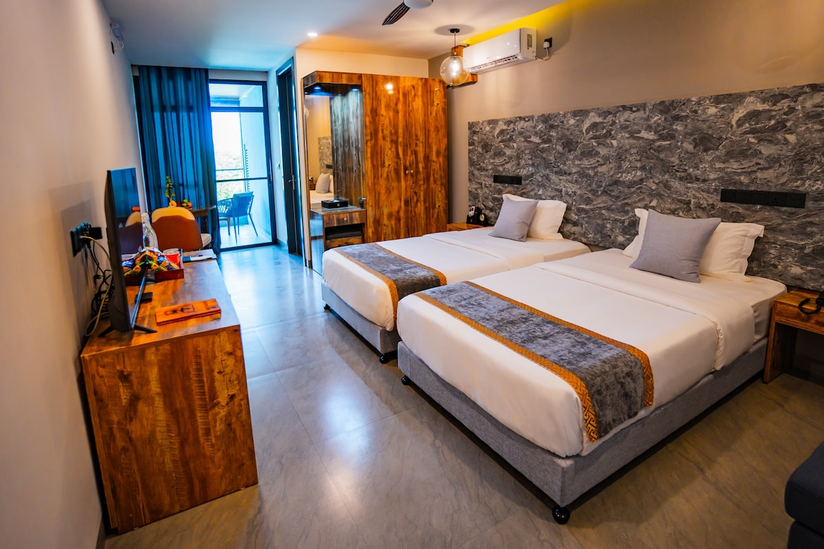 Relax in this bright and airy deluxe room with its own private balcony—perfect for enjoying your morning coffee or evening breeze. The space features stylish decor, a comfy bed, modern amenities, fast Wi-Fi, and an en-suite bathroom. Located just a 2-minute walk from the beach, it's ideal for both leisure and business travelers looking for a peaceful and elegant retreat near shops and cafés.