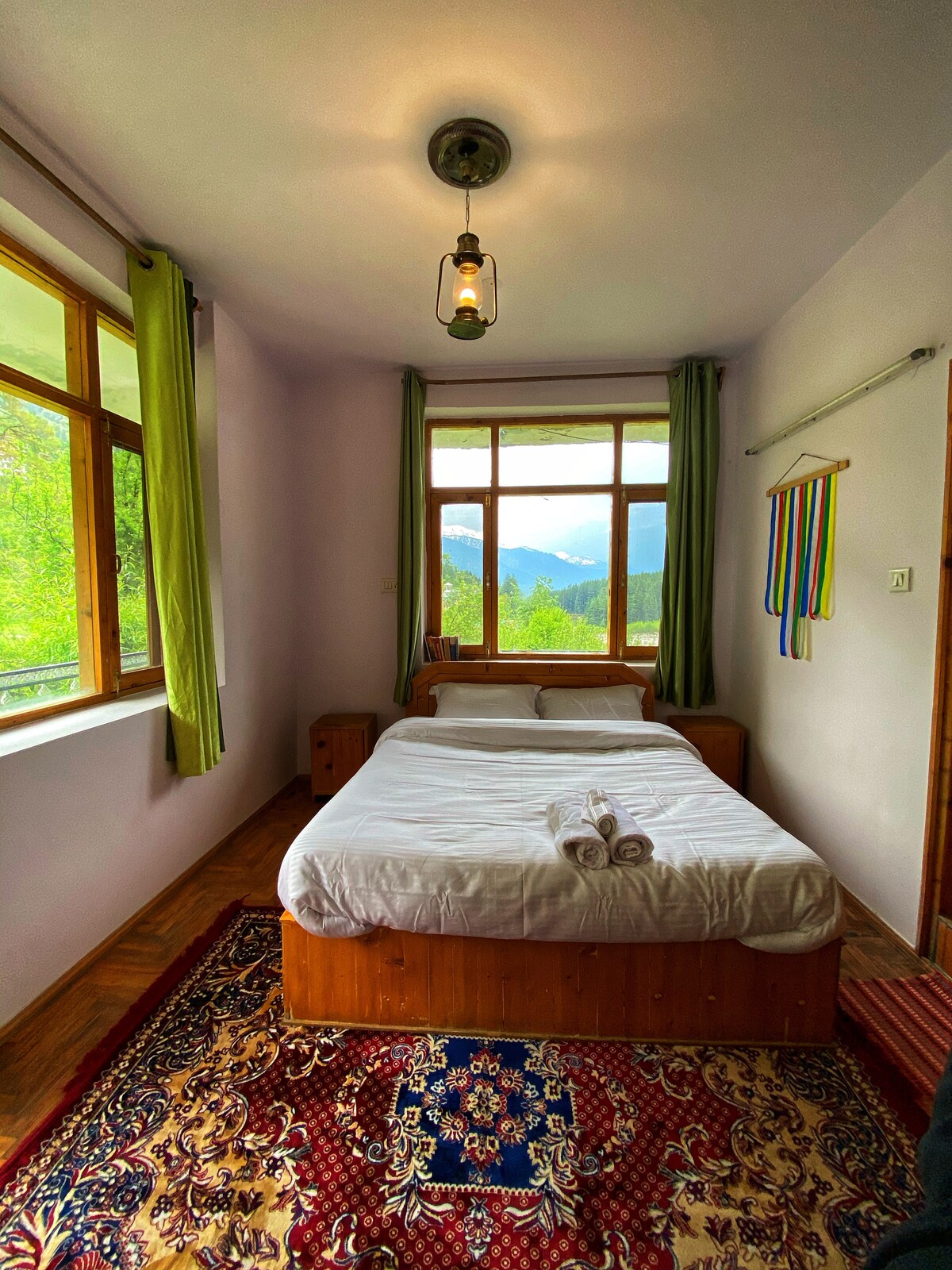 farm-stay is perfect for travelers seeking quiet, beauty, and authentic mountain living. Set in a picturesque location, the studio offers spectacular valley and mountain views, with the soothing sound of birds and the gentle roar of the Beas River creating a truly calming atmosphere. The fully equipped studio is designed for comfort and simplicity. It features a cozy double bed, wooden flooring, a study table, a clean modern bathroom, and a complete kitchen for self-cooking.
