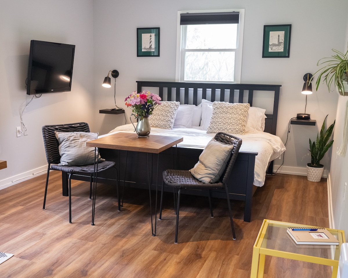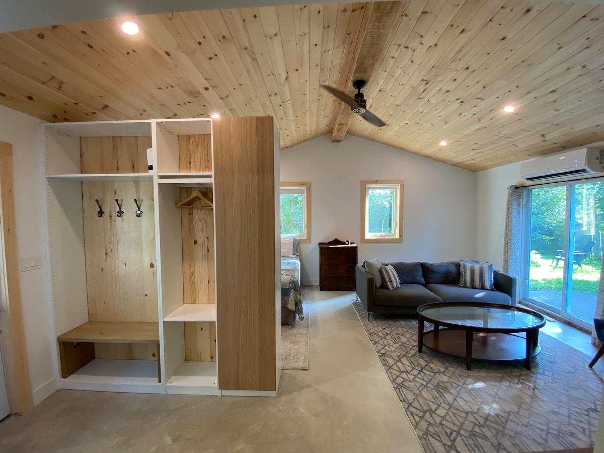 Rilassati e distenditi in questa tranquilla e privata pensione situata su 25 acri di foresta. Siamo a misura di famiglia e ti invitiamo a girovagare per la terra e a visitare le nostre anatre e galline! Se ti senti avventuroso, goditi un'escursione a piedi o in bicicletta su uno dei tanti sentieri locali raggiungibili a piedi nella capitale canadese dei sentieri! Più tardi, rilassati davanti alla stufa a legna interna o al braciere esterno. Rimani aggiornato sui tuoi programmi preferiti con Roku TV o gioca a Super Nintendo. Goditi la doccia a pioggia terapeutica appena rinnovata.