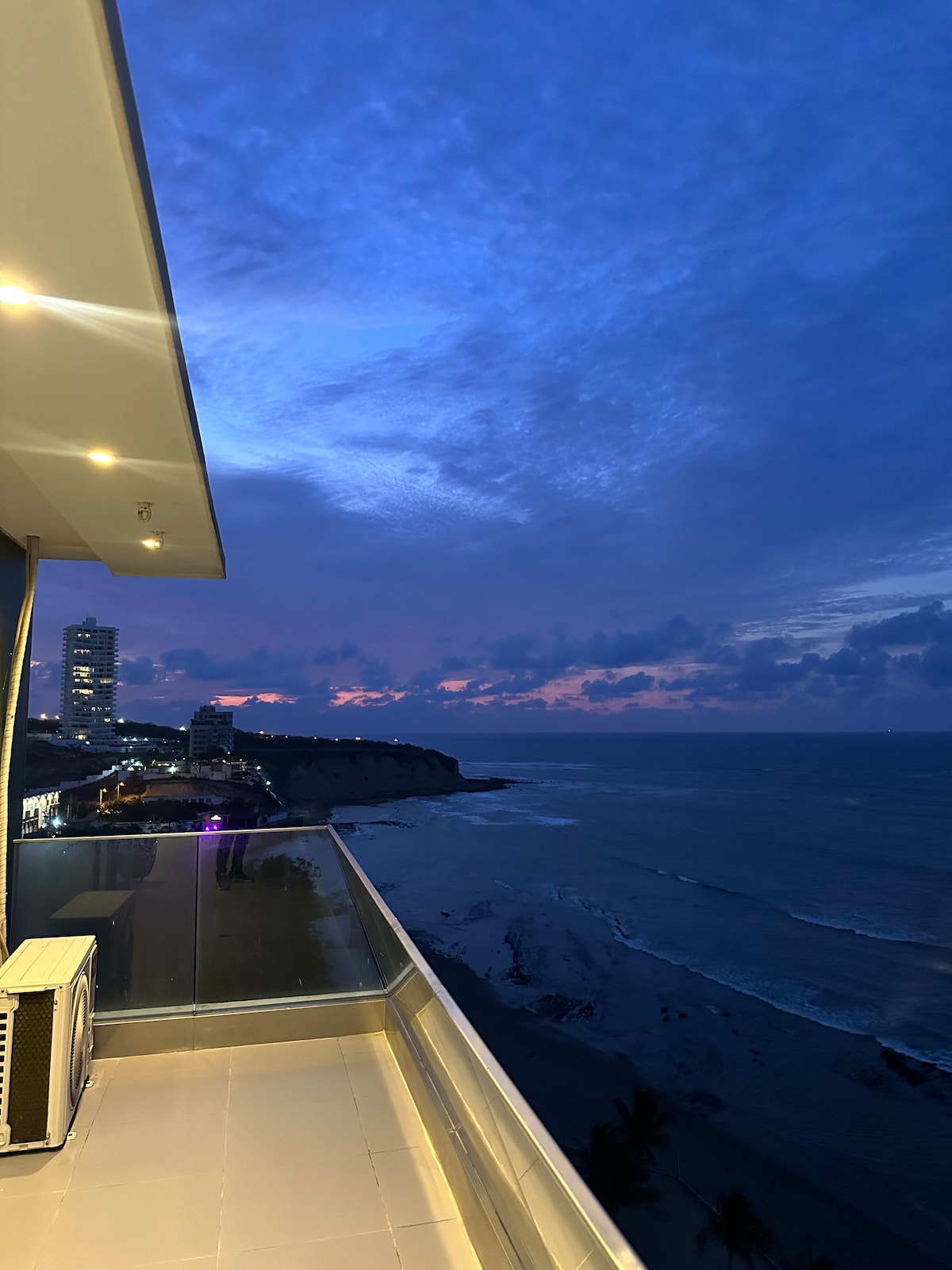Appartamento nel centro di Manta con vista mare. Situato sulla prima linea del mare con accesso diretto alla spiaggia di El Murciélago, a pochi metri a piedi dal lungomare panoramico, dai ristoranti, dal Pacific Mall e dai supermercati; dispone di generatore di corrente, piscina riscaldata, vasca idromassaggio, palestra, parcheggio, ascensore e area ricreativa per bambini, l'edificio è totalmente sicuro e le sue strutture sono adatte per una vacanza con la famiglia, il partner o gli amici.