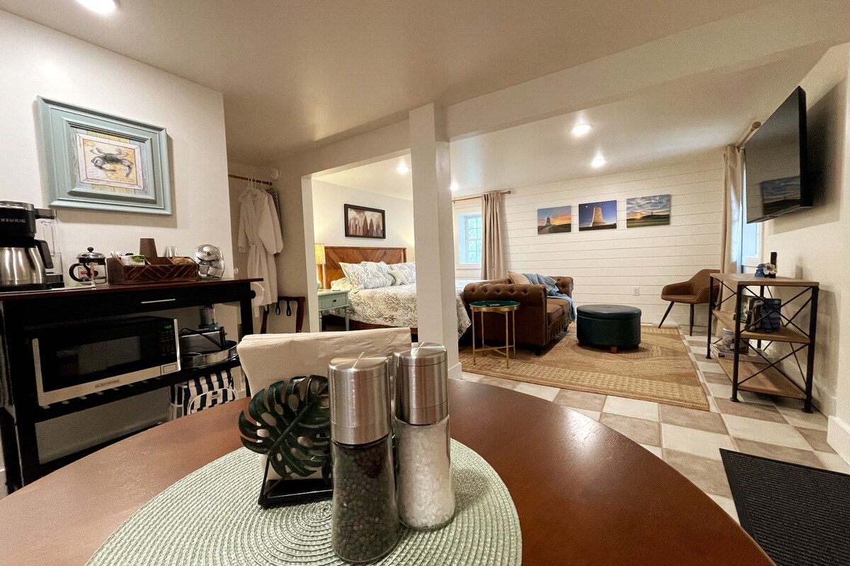 Ti diamo il benvenuto nella tua suite OBX Retreat! Spazio nuovo e moderno con camera da letto privata, bagno e cabina armadio. Letto matrimoniale super comodo, divano, TV da 50 pollici, minifrigo e caffè, naturalmente. Wifi veloce, parcheggio gratuito e facile, spazio esterno con tavolo da picnic e barbecue. Situato in posizione centrale rispetto a tutto ciò che offre OBX. A pochi passi e pedalate da ristoranti e negozi. Accesso gratuito a comode sedie a sdraio, frigorifero, ombrellone, canna da pesca e pesi per un po' di esercizio. C'è anche una bella doccia all'aperto!