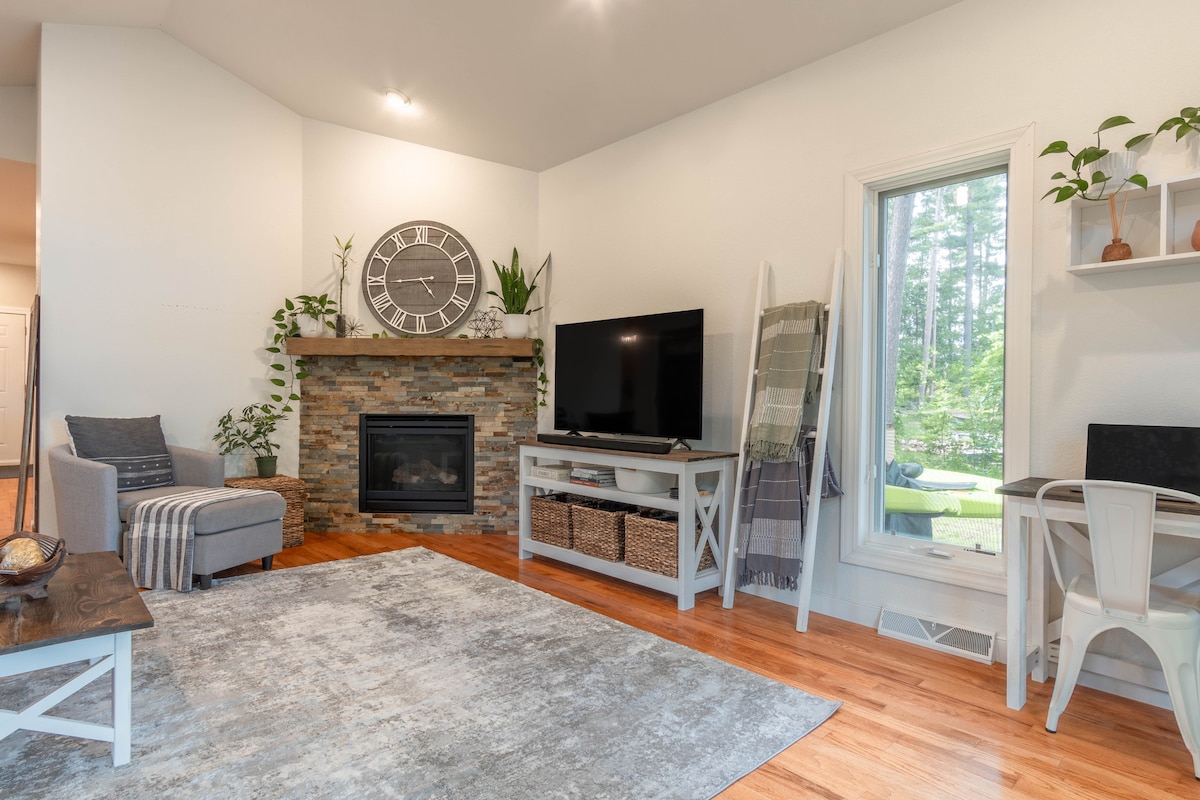 Soggiorna in questa moderna casa sul lago e goditi l'ambiente naturale con vista sul lago da quasi tutte le finestre! I 73 metri di fronte l'acqua sono a pochi passi dalla casa. Questa casa offre una camera da letto privata e un soggiorno con un divano letto matrimoniale estraibile per ospitare altre due persone! C'è un tavolo da fuoco sul patio anteriore e un braciere nel cortile sul retro per il tuo intrattenimento serale. Kayak, tavole da paddle e una canoa sono a tua disposizione!
