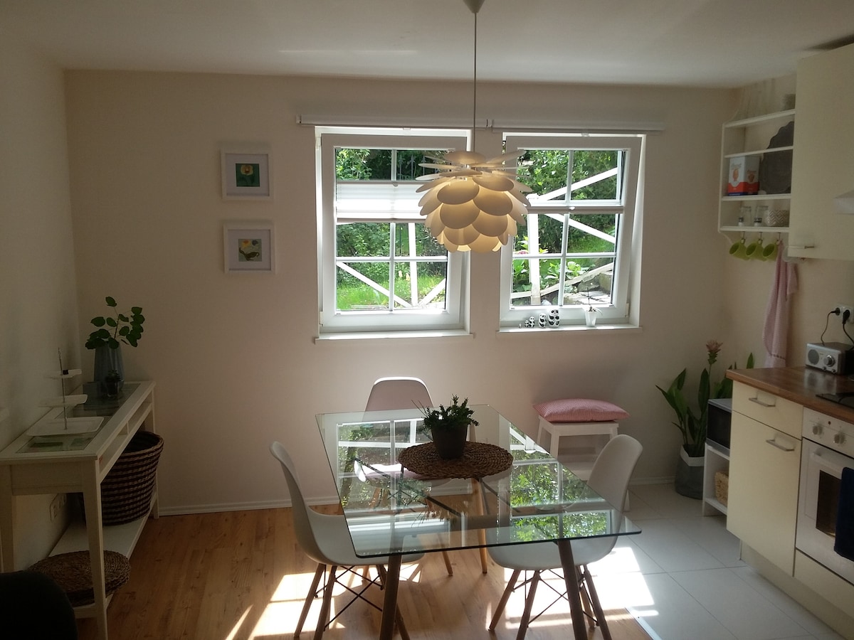 Affittiamo un appartamento per vacanze moderno, luminoso, di 60 m2 in una posizione idilliaca. La cucina è completamente attrezzata e per il caffè del mattino invita il giardino con posti a sedere, che confina direttamente con il bosco. Anche dalla grande doccia, a volte è possibile osservare un cervo nel bosco. La camera da letto è separata dal soggiorno e dalla sala da pranzo da una porta scorrevole. Attraverso la grande vetrata si gode di una bellissima vista verso il centro della città.
