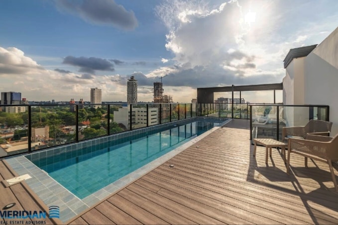 This unit is located in Asunción’s corporate center, just a few steps from the two largest shopping malls and World Trade Center, giving you access to the best restaurants and stores without the need for a vehicle. From its rooftop, you can enjoy stunning views of the city, featuring a variety of vegetation and different tree species, as well as the Asunción Bay, which belongs to the Paraguay River.
