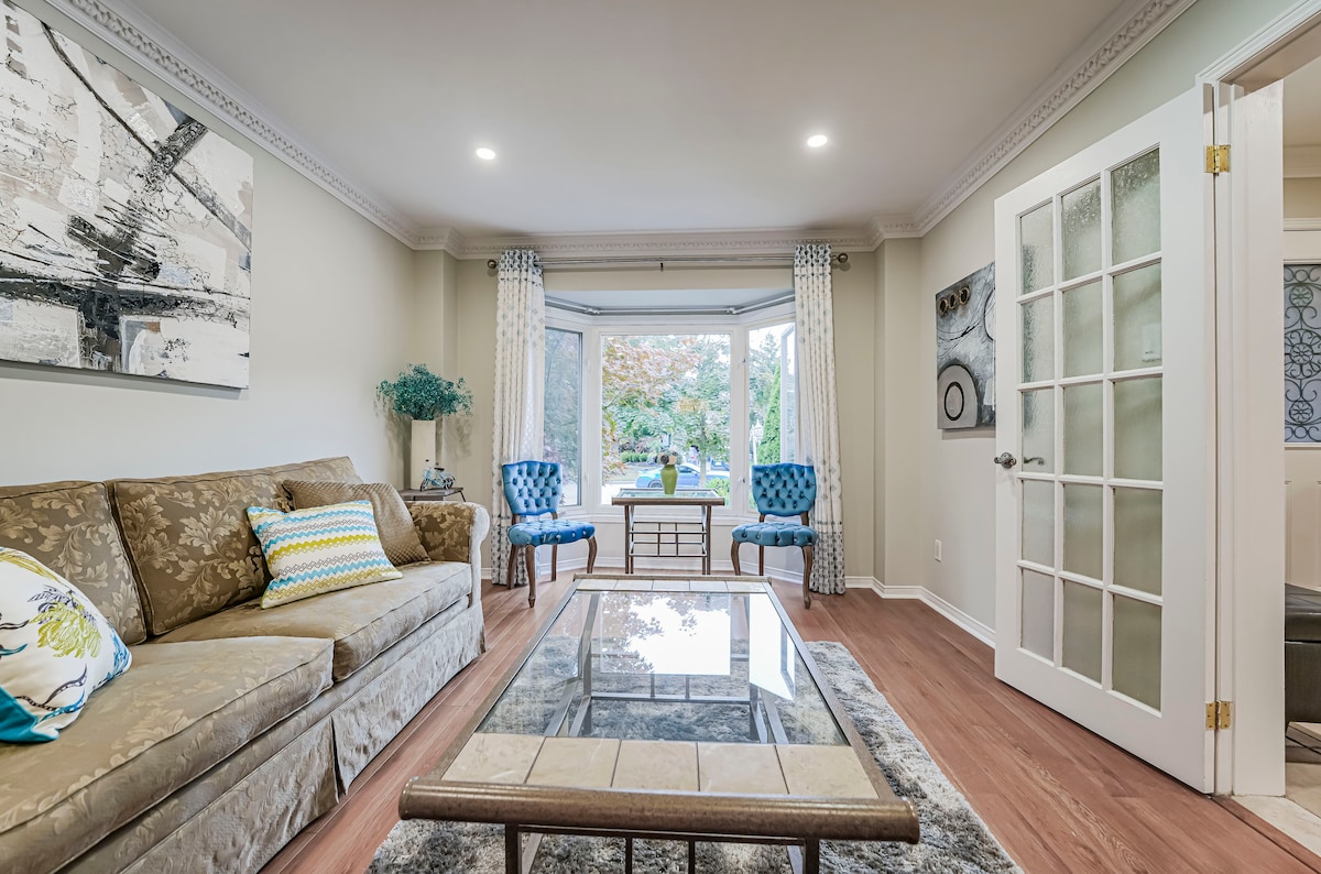 Vivi in stile cottage in questa suite ristrutturata, arredata e spaziosa (circa 93 metri quadrati) al piano inferiore di una casa a 3 piani (piano seminterrato) su un terreno scosceso in un vicolo cieco privato. - Ingresso indipendente - Due camere da letto: una matrimoniale e una con letto queen-size - Cucina completamente attrezzata, caffè/tè/snack in omaggio - Parcheggio gratuito nel vialetto - TV da 65 pollici con Netflix - Lavatrice/asciugatrice privata - Biancheria fresca di bucato, asciugamani e articoli da bagno - A pochi passi dal parco/sull'argine del fiume, a 10 minuti a piedi da Yonge attraverso il sentiero del cortile