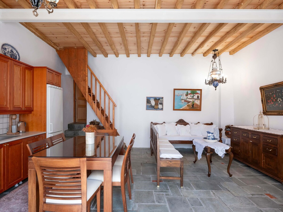 La nostra tradizionale casa in pietra delle Cicladi (65 mq) si trova nel centro del villaggio e dispone di un meraviglioso giardino con alberi di limone, arancio, melograno, albicocca, avocado e uva, dove potrai rilassarti e goderti la natura. L'appartamento offre una vista panoramica sul villaggio e una vista mozzafiato sul mare dell'isola di Naxos. La casa è ecologica, adatta al lavoro e alimentata a energia solare. Il wifi è affidabile anche per il lavoro. Accettiamo soggiorni più lunghi. Tutto ciò di cui hai bisogno dista 20 metri a piedi.