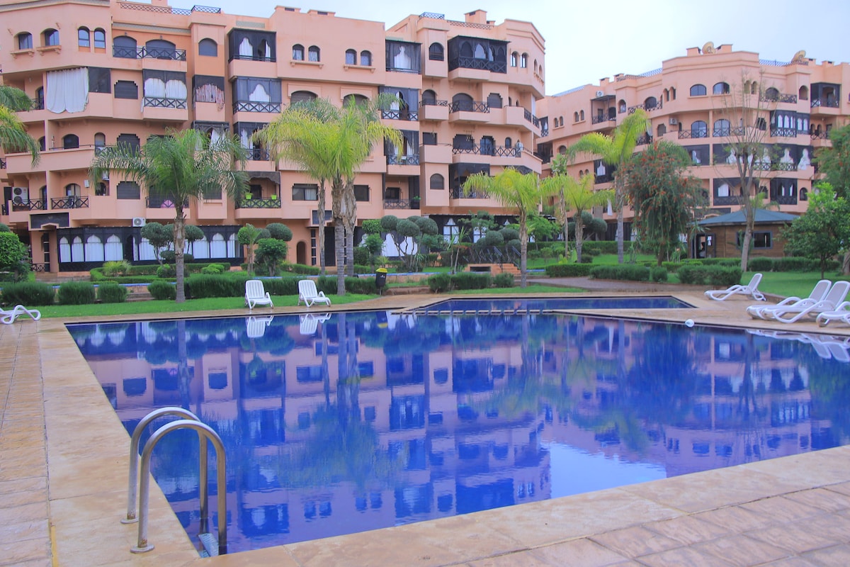 Appartamento Elegante e Centrale. Moderno, ben attrezzato con mobili nuovi. Si trova nel vivace quartiere GUELIZ. Dispone di: - ampio e comodo divano a U, - TV 55 pollici di ultima generazione ( wifi , IPTV, Netflix), - TV 43 pollici in camera, - tavolo da pranzo per 2 persone, - bar con 2 sgabelli, - cucina ben attrezzata, - 1 camera da letto letto 160/200, biancheria da letto Haut Standing Neuve, - 1 bagno, - 1 bagno con bagno. PISCINA al piano terra. PARCHEGGIO GRATUITO sotto terra