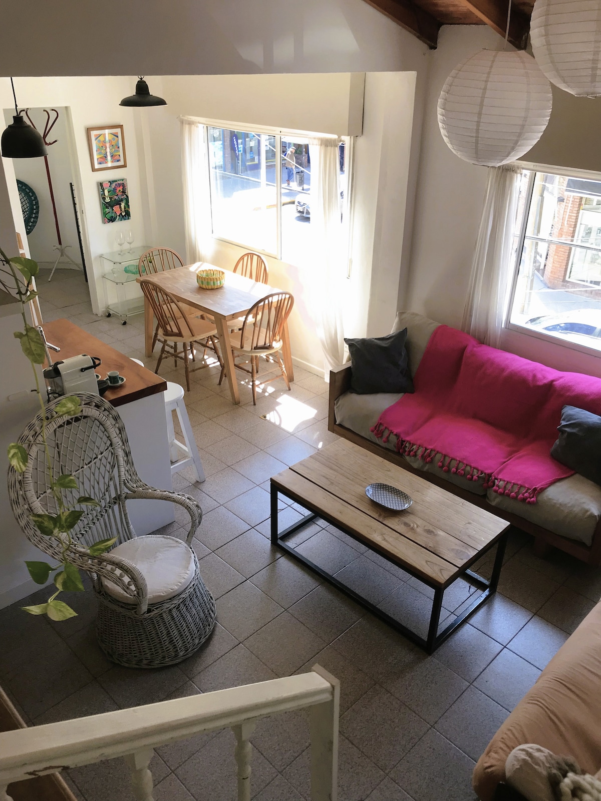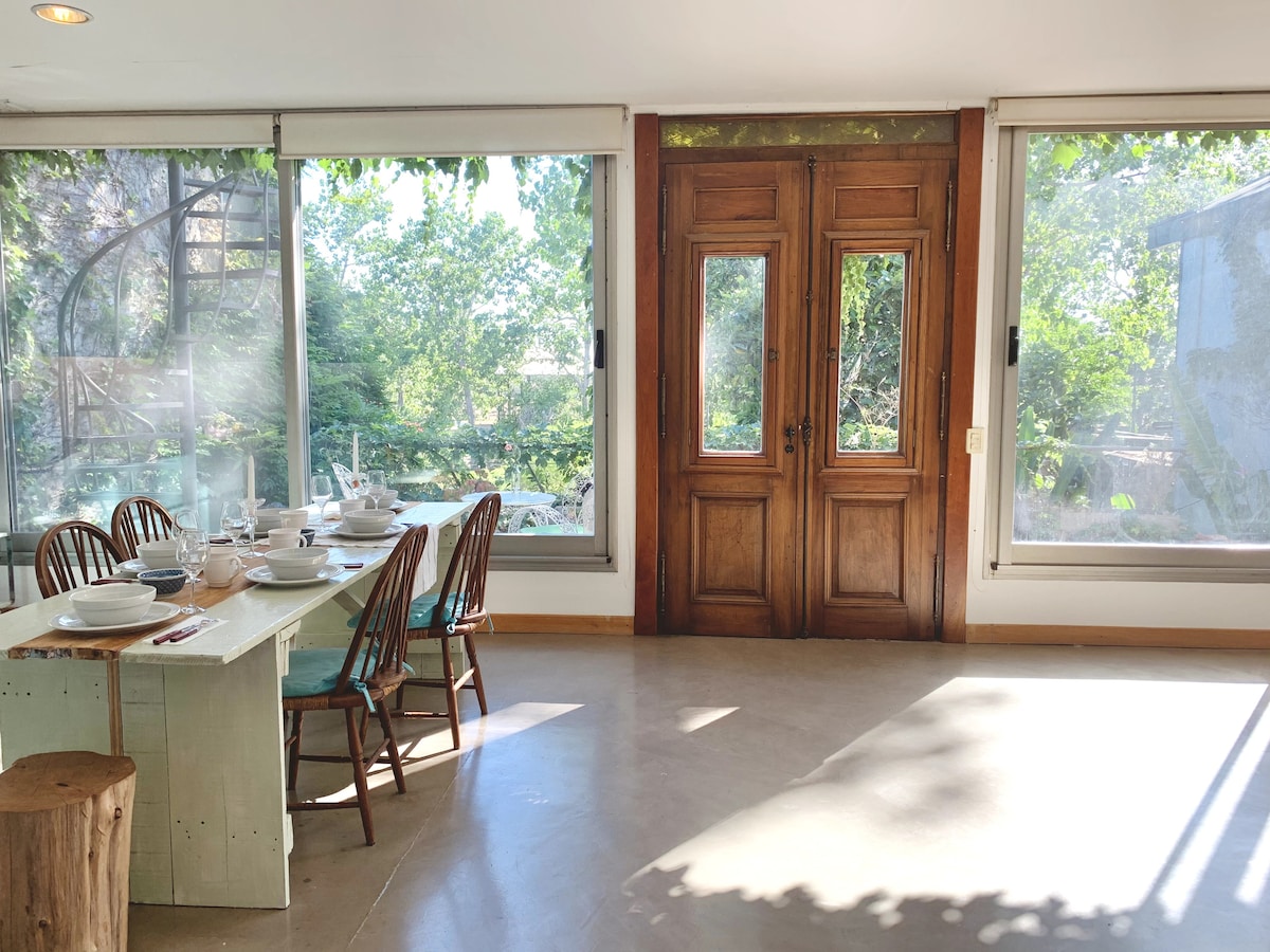Casa minimalista en planta alta, rodeada de verde, con terraza, gran balcón y vista al hípico. Funciona como 3er piso. Loft luminoso, cama super king, vidrios dobles, losa radiante y aire acond. Entrada independiente, buen aislamiento. Mi estudio está en planta baja con acceso totalmente separado. Ideal para 1 o 2 personas tranquilas que buscan descanso cerca del río y gastronomía, a 30 min de CABA y Tigre. No apta para eventos/producciones.