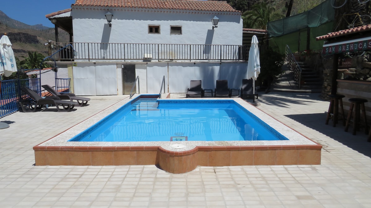 Situato sul versante meridionale dell'isola, nella caldera vulcanica di Tirajana, un luogo idilliaco. La vista si apre a 360 ° sui palmeti della valle e sulle cime vulcaniche. Dispone di una piscina con cascata, riscaldata e trattata con sale. Si trova in una tenuta accanto a un'altra casa vacanze per due persone. Entrambe le case sono completamente indipendenti e dispongono di accessi e servizi propri, essendo il parcheggio e la piscina le uniche aree comuni. Pertanto, la privacy è garantita.