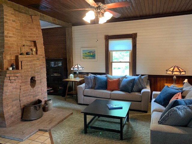 La suite dispone di due ampie camere da letto, una camera da letto con un letto matrimoniale e l'altra camera da letto ha un letto matrimoniale e due letti singoli. Queste due camere condividono un bagno con una vasca con doccia. Al piano di sotto c'è un salotto condiviso, una cucina e una sala da pranzo. La locanda è a tema per essere accogliente atmosfera natalizia con divertenti tocchi di arredamento uomo-falena e una piccola biblioteca esoterica. Ci sono altre stanze in affitto nella casa. Fai un salto indietro nel tempo e rilassati con un libro, godendoti la terrazza con vista sul fiume Ohio.