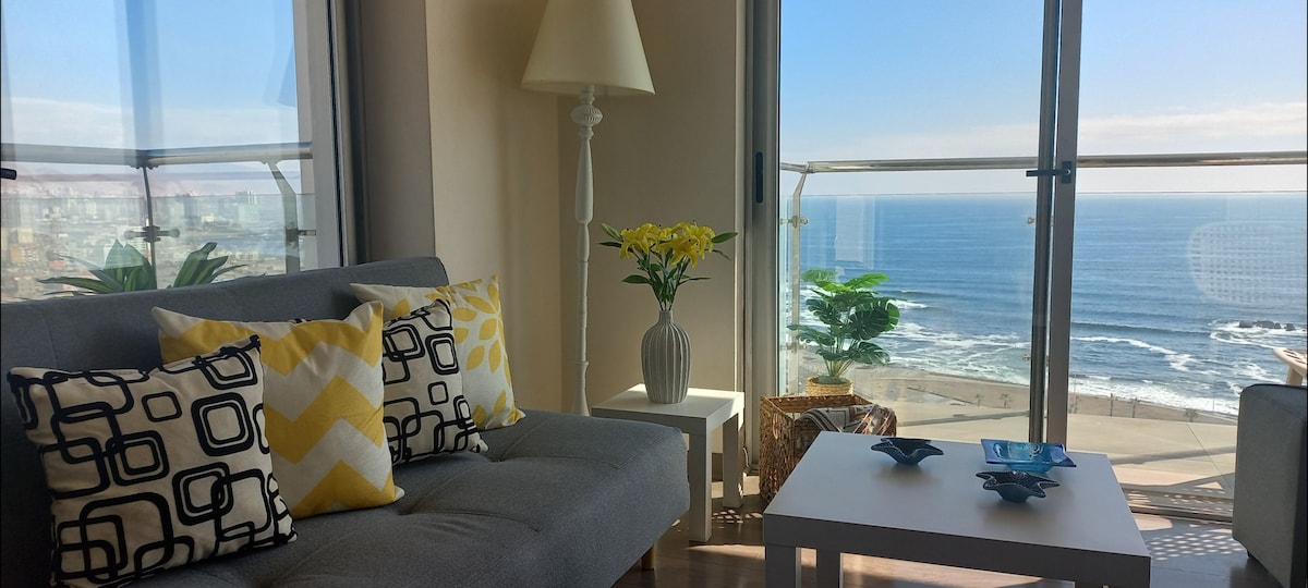 Dpto. Entrada autónoma, vista al mar y parking privado indoor. full amoblado, sector lider express A 10 min del centro. A 2 cuadras a pies de super lider express. A 5 min de la Municipalidad. A 3 min del Hospital Regional. A 3 min del terminal de buses. A 30 min del aeropuerto. Wifi y televisor smart tv de 43”, con Netflix, HBO premium. Cocina full equipada; Hervidor, horno eléctrico, microondas y lavadora secadora sillón reclinable. Silla reposera con vista al mar Conserjería 24 hr