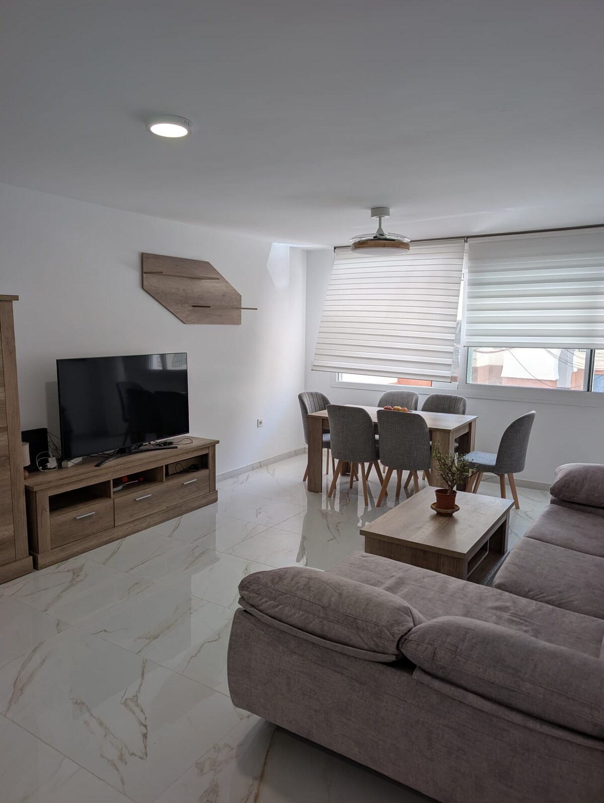 Appartamento incantevole e accogliente. È composta da un soggiorno (TV da 65", cheslong, tavolo per sei commensali) Cucina ( piano cottura, frigorifero, forno, forno a microonde, lavatrice, asciugatrice, tostapane, frullatore, macchina per il caffè, ferro da stiro), tre camere da letto con armadio e 1,50 letto. Ha un bagno con doccia e anche un WC. Aria condizionata (riscaldamento a freddo) nel soggiorno e ventilatori nelle camere da letto. Internet-Wifi. Tutti gli ambienti sono molto luminosi