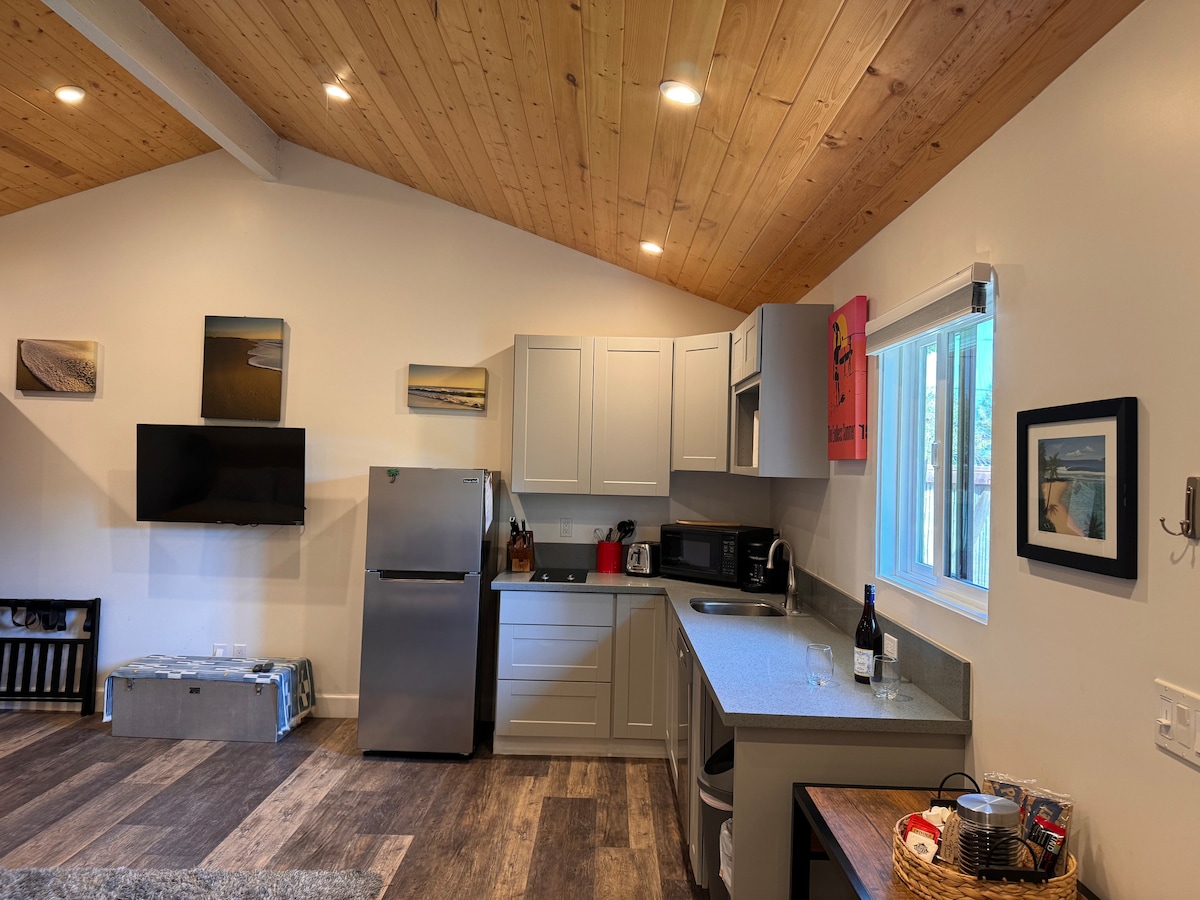 Un monolocale luminoso e confortevole con soffitti alti e una cucina completa che include un bancone per lavorare o mangiare. Fornello a gas, stoviglie Fiestaware, pentole Revere, posate, forno a microonde, macchina per il caffè, bollitore, tostapane, frullatore e frigorifero. Cortile completamente recintato con cancello privato, patio e prato. La spiaggia appartata di Mesa Lane si trova a 2 isolati di distanza, mentre la Douglas Family Preserve, con splendide viste sulla scogliera, dista 5 minuti a piedi dalla casa.