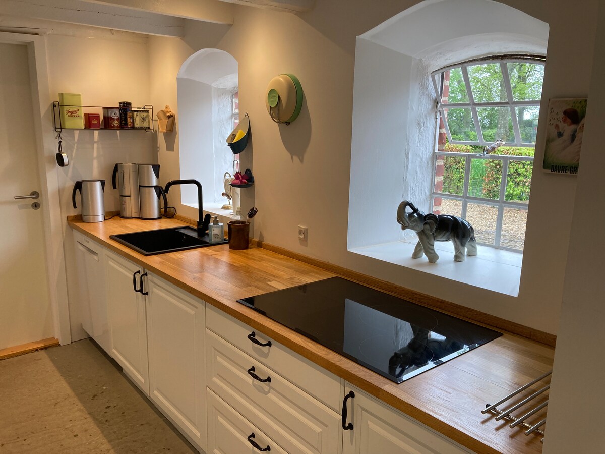 La casa è composta da un soggiorno, una camera da letto, una cucina e un bagno al piano terra della residenza del manager per Hårby Dairy. Ingresso indipendente e parcheggio gratuito. La casa è costruita nel 1905, ci sono pavimenti in legno massello e soffitti alti in ogni stanza. Camera con letto matrimoniale e spazio per culla - Soggiorno con tavolo da pranzo e 4 sedie, divano letto con 2 posti letto, TV, wifi, libri e giochi - Cucina con lavastoviglie, frigo, piano cottura, - Bagno con wc, box doccia, lavatrice. Spazio esterno recintato con zona pranzo e barbecue.