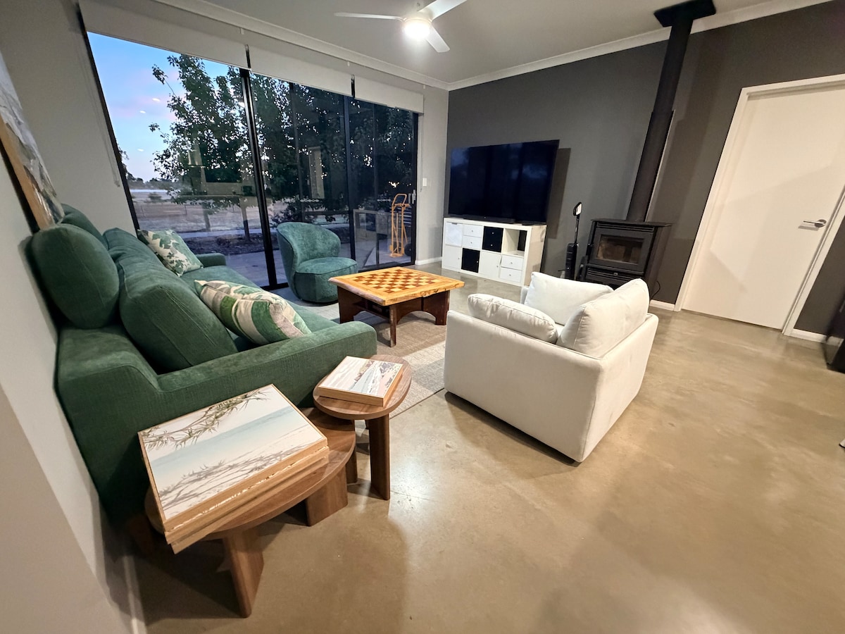 Fuggi nella nostra accogliente baita sul mare su 100 acri appartati di bellezze naturali. Rilassati vicino al caminetto interno e sotto le stelle del focolare all'aperto. Immergiti nella vasca da bagno all'aperto e goditi la cucina completa e l'ampia terrazza offre una vista mozzafiato sulla valle. Il nostro chalet è vicino alla zona principale della cantina, perfetta per le avventure di degustazione di vini. A sole 2,5 ore da Perth, è una vacanza facile. Fai una nuotata rinfrescante nella diga, esplora il piccolo vigneto o fai diverse passeggiate nella boscaglia.