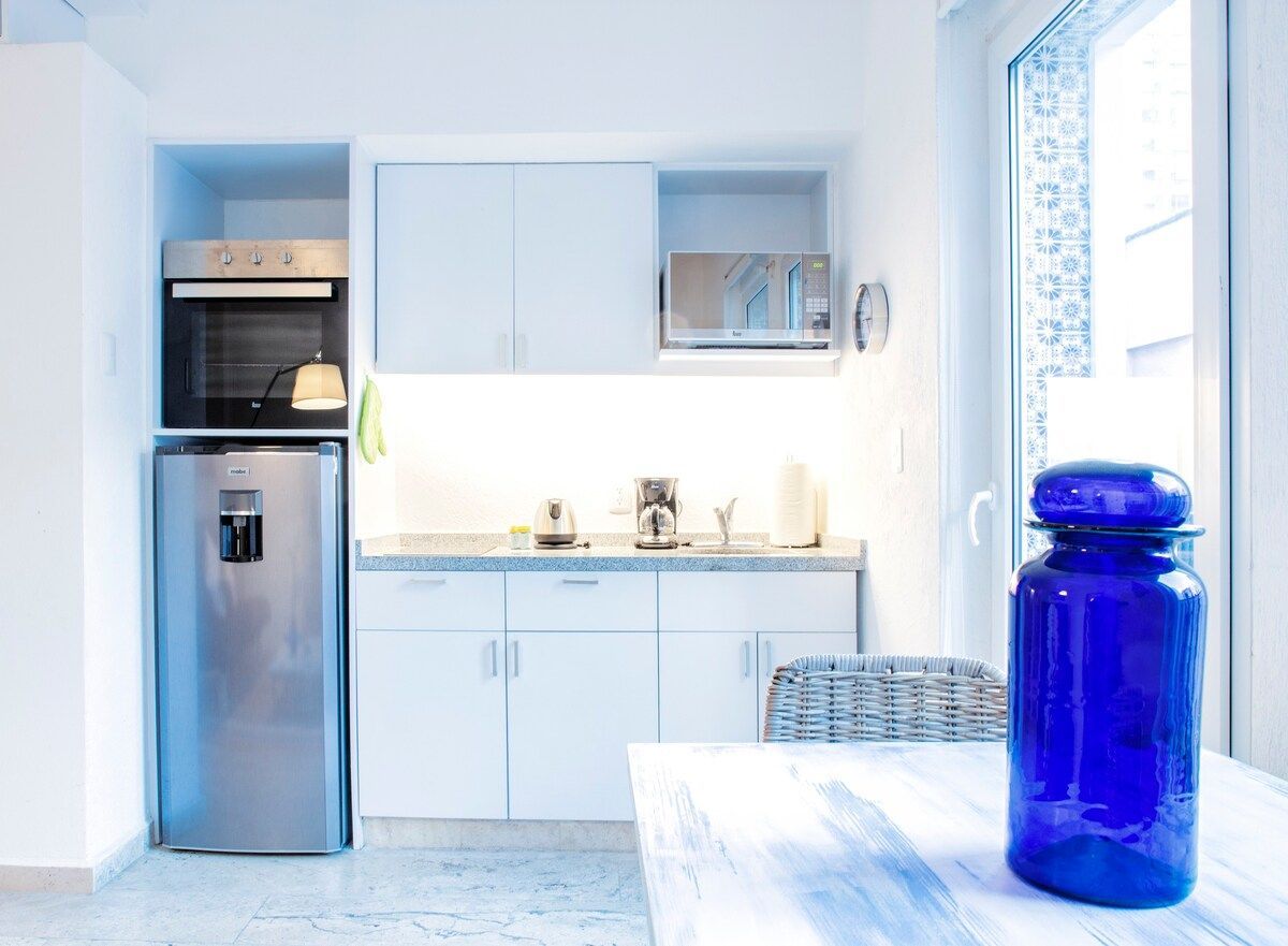 Loft en excelente ubicación en el Centro Histórico, con decoración estilo bohemio. Ideal para 2 personas, máximo 3 (3er huésped con costo extra). Cocina equipada con horno, microondas y utensilios. Sala con futón matrimonial cómodo, recámara con clóset y cama Queen. WiFi. Edificio con conserje y seguridad 24/7. Disfruta del rooftop compartido con una increíble vista de la ciudad. ¡No te pierdas la experiencia! Check-in a partir de las 4 pm.