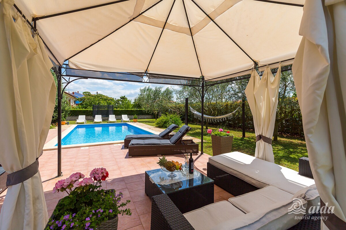 Spaziosa villa appartata in una posizione tranquilla e silenziosa nella terra istriana, che offre comfort e relax. Perfetta per una vacanza e a breve distanza da tutti i luoghi di interesse. In una zona molto tranquilla, la villa offre privacy, pace e sicurezza in un luogo confortevole immerso nel verde. Nel periodo giugno-agosto, il giorno del cambio è il sabato; per soggiorni superiori a 7 notti, invia una richiesta. Negli altri mesi, il giorno di check-in o il soggiorno minimo sono flessibili e ti consigliamo di inviare una richiesta per confermare la disponibilità.