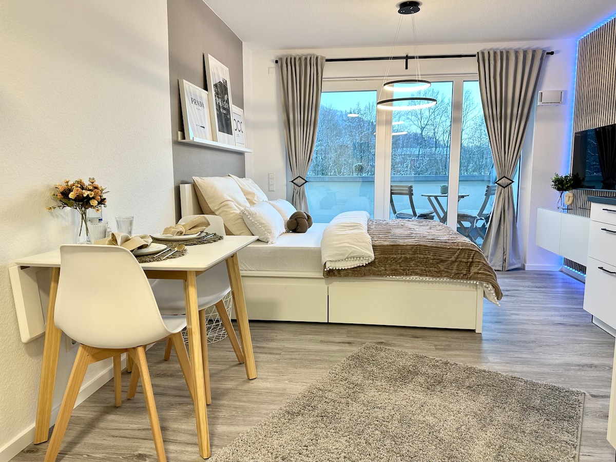 Your temporary home welcomes you in an open and bright space. The apartment is centrally located in the beautiful “Heimbachsiedlung” district and offers everything you need within a short distance. Bus stop, local shopping center, post office, pharmacy and doctors ... everything in the immediate vicinity and in a few minutes you can also reach the city center of the industrial area West with everything your heart desires: Lidl, Aldi, Kaufland, Denns, dm, hardware store, shopping and much more.