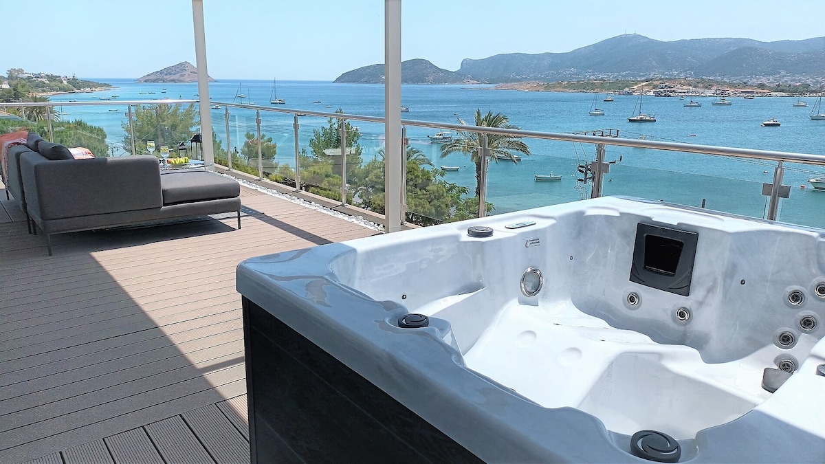 Nuovo attico modernamente attrezzato di fronte al mare nella località turistica di Porto Rafti in Attica, a 20 minuti di auto dall'aeroporto di Atene. Appartamento di 120 m² con un'enorme veranda con vista mozzafiato sul mare. La vasca idromassaggio e gli enormi divani sulla veranda, nonché il design raffinato della casa, ti permetteranno di rilassarti e goderti il tuo soggiorno con noi. L'appartamento è situato nella parte centrale del resort e si affaccia direttamente sul lungomare, dove troverai molti caffè, ristoranti e negozi per la tua passeggiata serale.