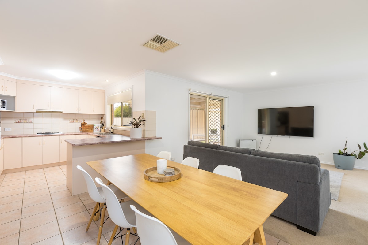 Relax in comfort with 2 queen beds, 2 king singles & a sofa bed. Enjoy a bright open-plan layout, modern kitchen, and ducted heating/cooling. Unwind on the private deck and take in the peaceful setting. Newly renovated, spacious, and only 1 km to cafes, shops & the Murray River. Ideal for families, groups or business stays!