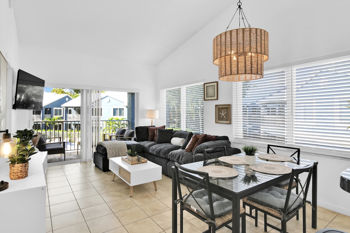An old Florida apartment that has been updated with a new kitchen. Very clean. Kitchen equipped for cooking! Central air conditioning! Walk to Whole Foods. Starbucks, Trader Joe's, and many restaurants are a very short drive away. Fully equipped kitchen Parking: free, off-street, two cars Washer & Dryer 4K SmartTV, log on to your Netflix/HBO/etc account Private Patio Gas grill Work from home: office desk, office chair, ethernet jack, 34" ultra-wide monitor, high speed Wifi with backup