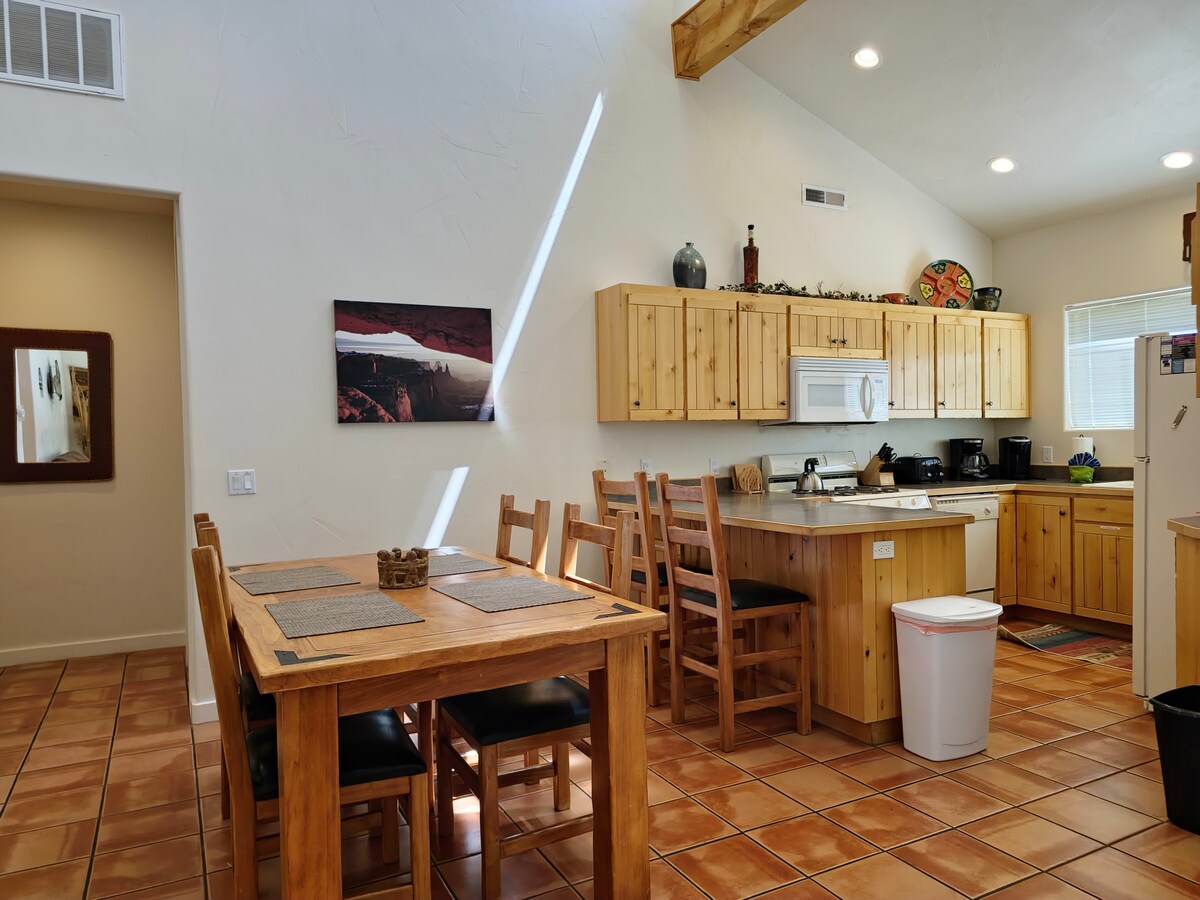 Rilassati dopo le tue avventure nel deserto in questa bellissima unità angolare situata a Rim Vista Village, a soli 7 minuti di auto dal centro di Moab. La spettacolare area ricreativa intorno a Moab è famosa in tutto il mondo per le escursioni, l'arrampicata su roccia, le opportunità di guida di veicoli fuoristrada, le mountain bike, il golf, il rafting e l'osservazione del cielo notturno. Siamo a soli 10 km dalla città e vicino ai parchi nazionali delle Arches e delle Canyonlands. L'area di Moab, adatta a tutte le stagioni, offre davvero qualcosa per tutti i gusti!