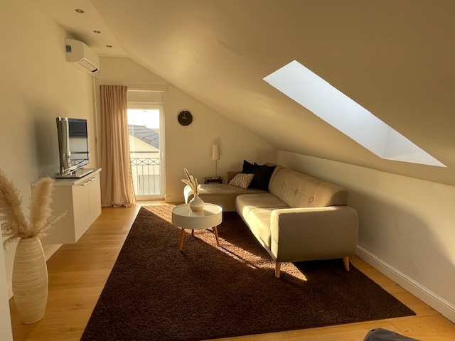 Unsere zweistöckige 60 Quadratmeter Oase mit einer sonnigen west-Dachterasse, heißt sie willkommen. Sie liegt in zentraler Lage zur A5, Frankfurt (Flughafen), Darmstadt oder Heidelberg. Direkt vor der Haustür finden sie auch viele Rad- und Wanderwege. Die große vollausgestattete Wohn-Essküche lädt zu einem gemütlichen beisammen sein ein. Das Schlafsofa bietet einen weiteren Rückzugsort. Oben befindet sich das helle Wohn-Schlafzimmer mit Dachterasse, einem Schreibtisch und einem Doppelbett.