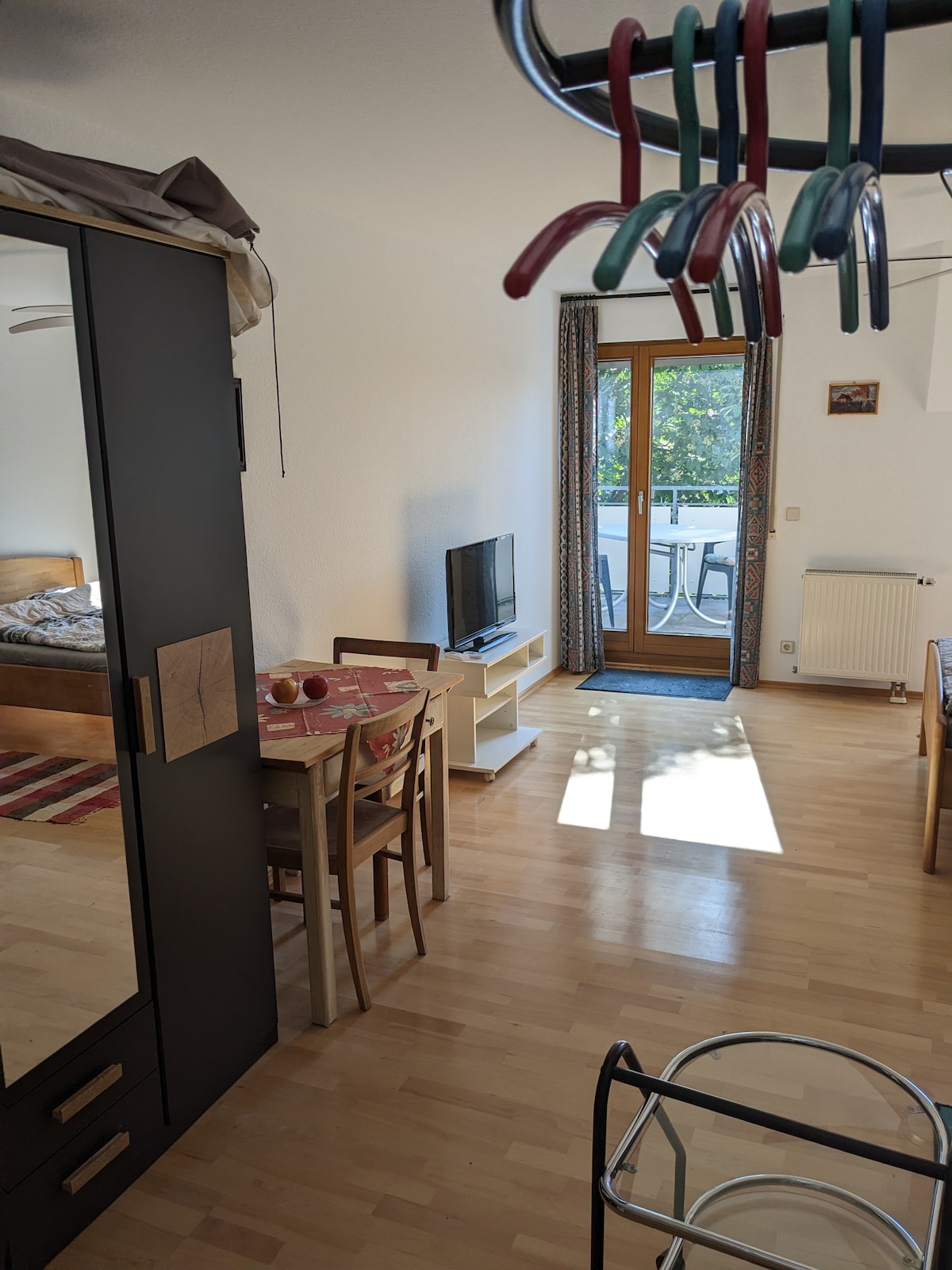 Gemütliches Apartment mit Allem was man so braucht. Es gibt eine kleine, gut ausgestattete Küche. Hier findet ihr auch eine Kaffeemaschine, Wasserkocher, Toaster und einen Eierkocher Das Bett hat die Maße 180x200 und ist selbstverständlich komplett überzogen. Der Balkon hat eine ordentliche Größe und verfügt über eine Glasüberdachung mit Markise, so das ihr im Sommer draußen sitzen könnt. Im Badezimmer findet ihr Dusch-und Handtücher. Und für die Leseratten unter euch ist auch gut gesorgt.